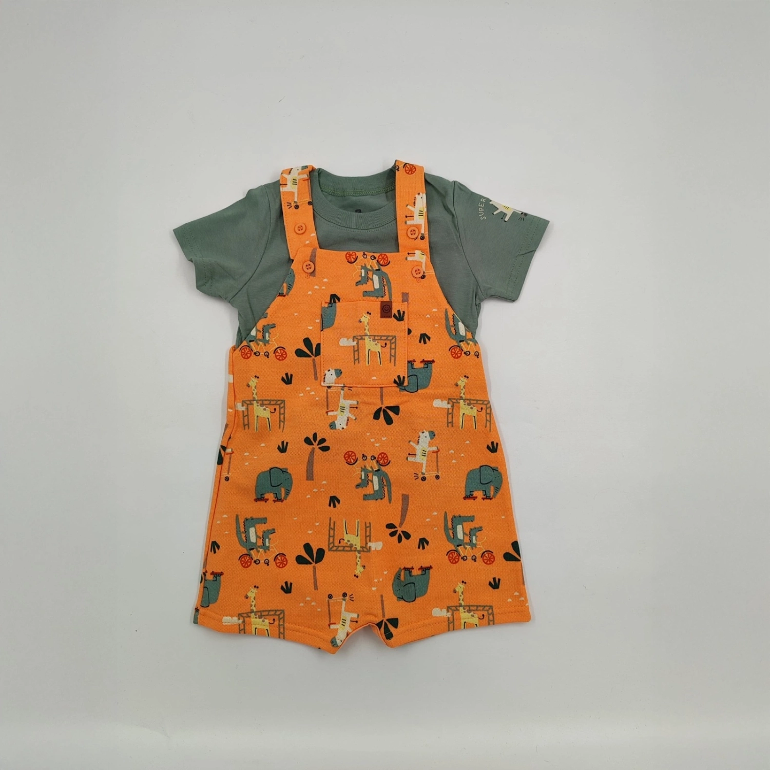 يتكوّن هذا الطقم من تيشيرت قطني ناعم بياقة دائرية وأكمام قصيرة، إلى جانب أوفرول من الصوف المطبوع يتميز بحمالات بأزرار وجيب عملي وسحاب كبّاس في منطقة الحفاض لسهولة التغيير. مثالي للأولاد النشطين.