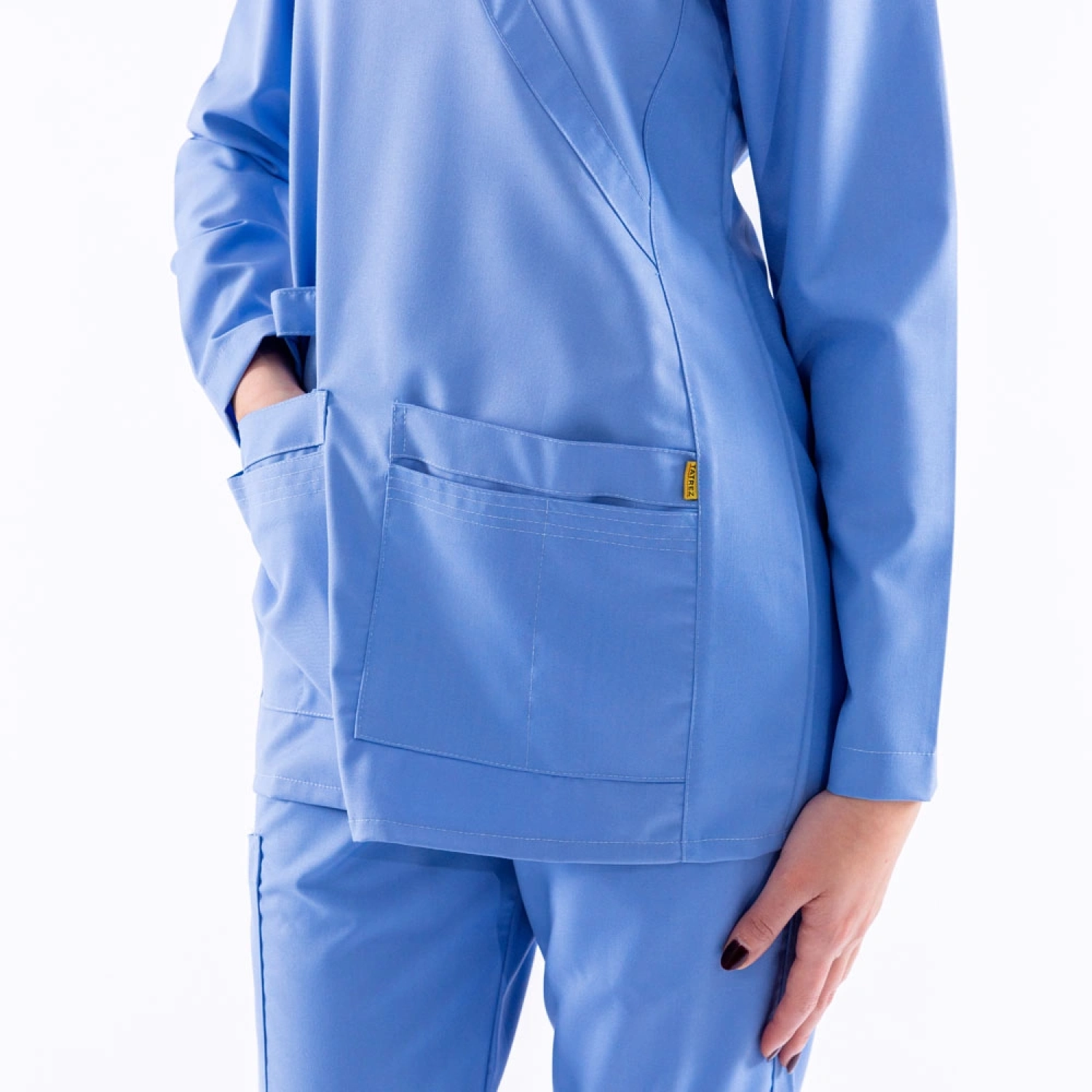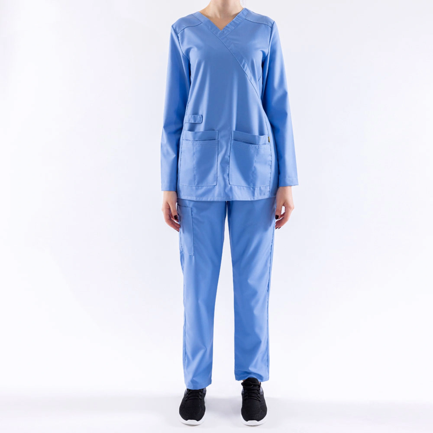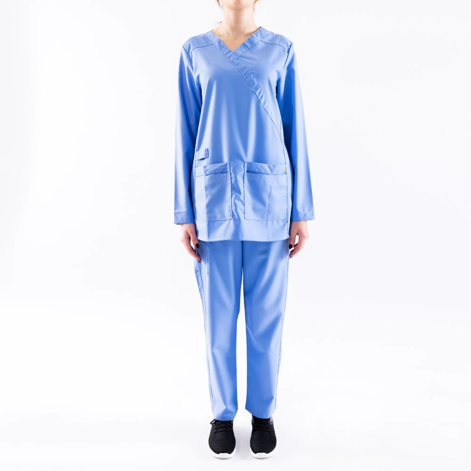 زي طبي نسائي بلون أزرق سماوي، يتميز بتصميم أنيق مع بلوزة طويلة الأكمام بقصة ملفوفة لمظهر عصري ومريح. مصنوع من قماش متين وخفيف يضمن راحة طوال اليوم، مع جيوب عملية واسعة لحمل الأدوات الأساسية بسهولة. يوفر السروال الطبي ملاءمة مريحة لحرية الحركة أثناء العمل. بفضل خامته القابلة للتهوية، يعد هذا الطقم خيارًا مثالياً للعاملات في المجال الطبي الباحثات عن الأناقة والراحة.
