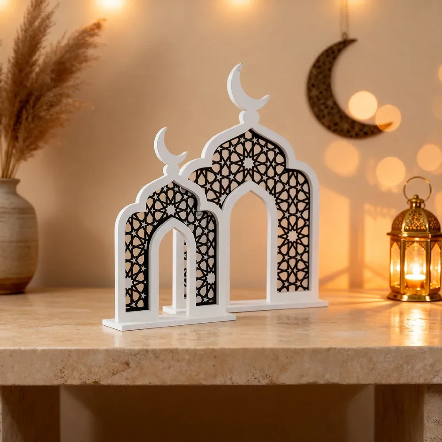 يتضمن هذا الطقم الديكوري هيكلين للقوس صُنعا بجمالية عالية، حيث يتميز كل منهما بإطار أسود مع أنماط شبكية ذهبية معقدة. يتوج كل قوس بهلال، مما يجمع بين الأناقة العصرية والالهام المعماري الإسلامي التقليدي. مثالي لشهر رمضان وعيد الفطر، حيث تعمل هذه الأقواس كقطع مركزية متطورة أو لمسات جمالية للأرفف والمداخن، مما يضيف لمسة ثقافية متميزة إلى ديكور منزلك.