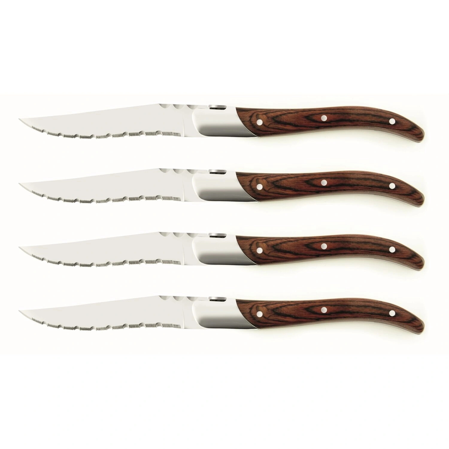 طقم فاسونا يضم أربعة سكاكين ستيك عالية الجودة مزودة بشفرات حادة من الفولاذ المقاوم للصدأ ومقابض خشبية داكنة. مصممة لتقطيع شرائح اللحم بسهولة، مع الجمع بين المتانة والأناقة على طاولة الطعام.