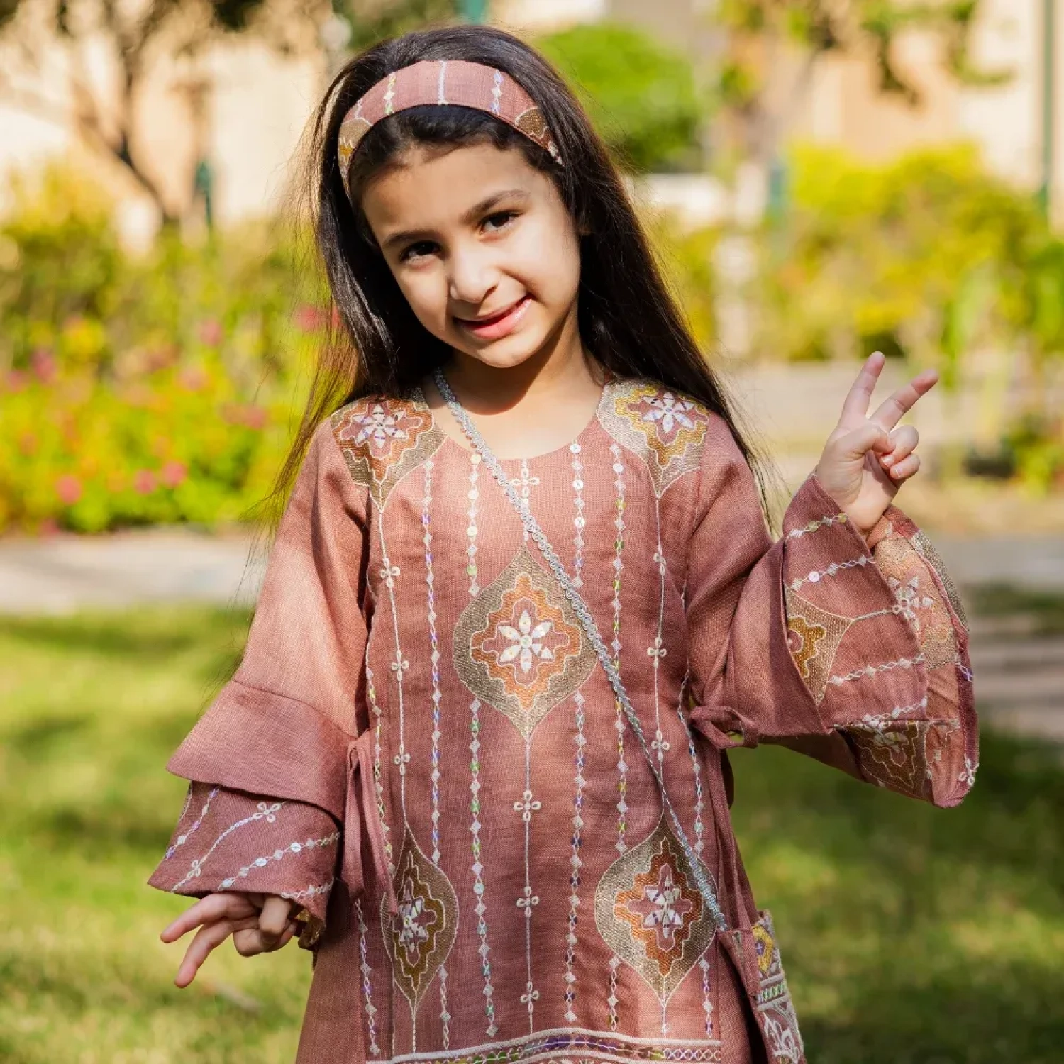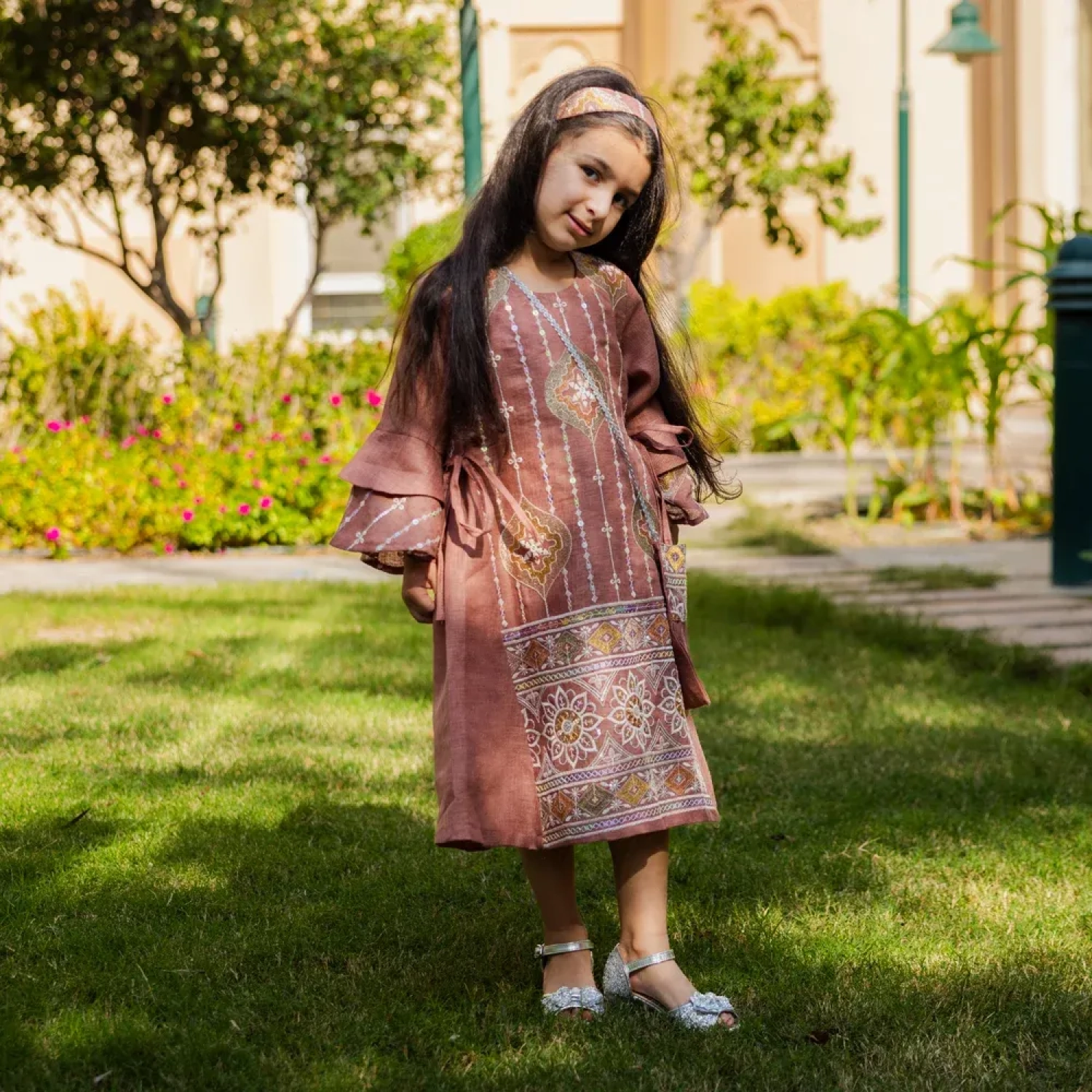 فستان مصنوع من الكتان (اللنن) بلون وردي باهت (Dusty Rose)، مزين بنقوش تراثية تمنح صغيرتكِ إطلالة تجمع بين البراءة والرقي. يتميز القماش بخفته وقدرته على تمرير الهواء، مما يضمن لطفلتكِ راحة تامة ومظهراً احتفالياً أنيقاً في التجمعات العائلية والمناسبات الخاصة.