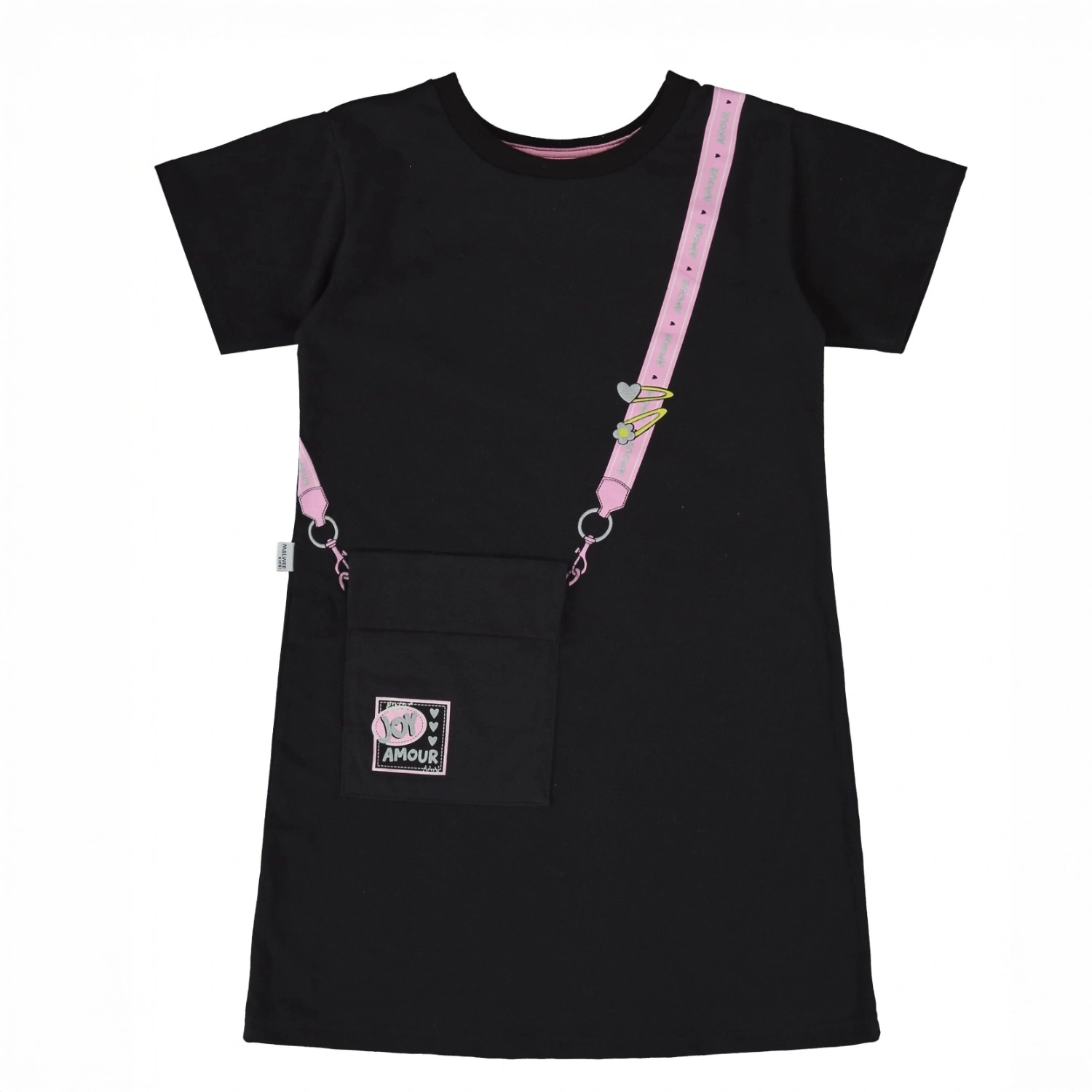 فستان تيشيرت قطني مرح بتصميم مريح، يتميز بياقة دائرية وأكمام قصيرة، مع طبعة لامعة على الكتف تحاكي حزام حقيبة أنيق. مزيّن بجيب أمامي عملي، ليكون الخيار المثالي للبنات اللاتي يحببن الجمع بين الأناقة والراحة في إطلالة واحدة.