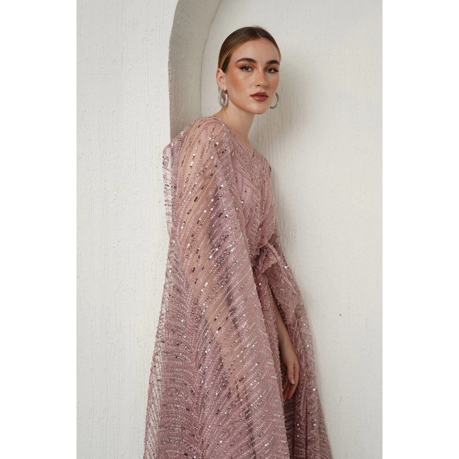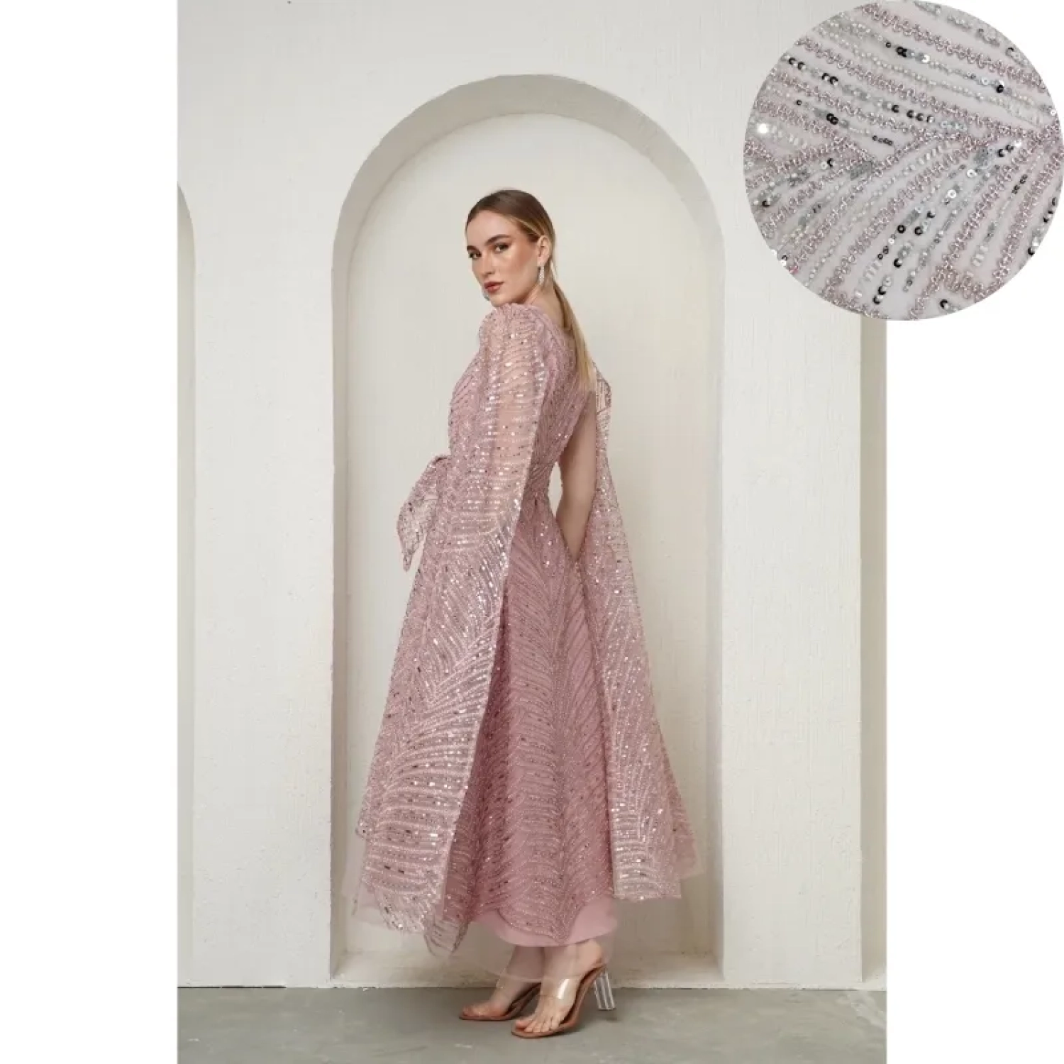 فستان بأكمام كاب- وردي فاتح