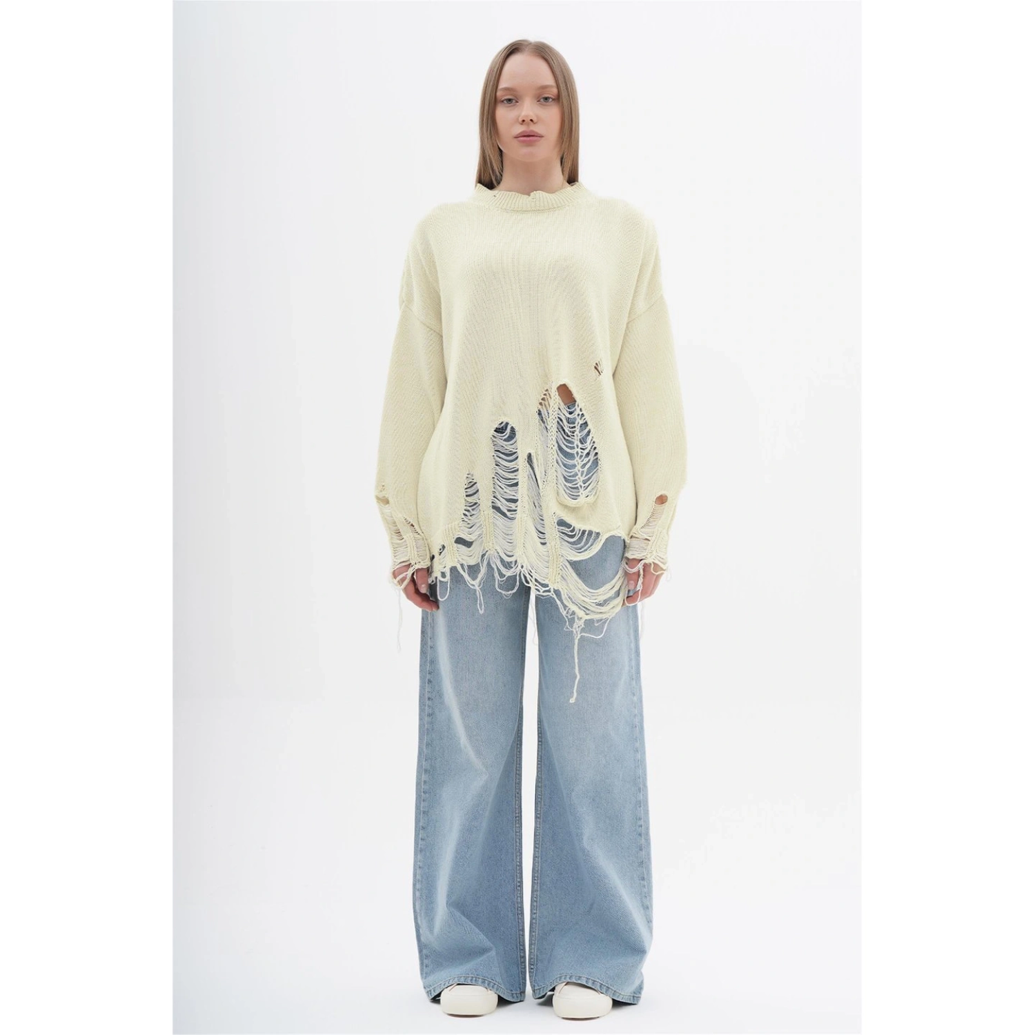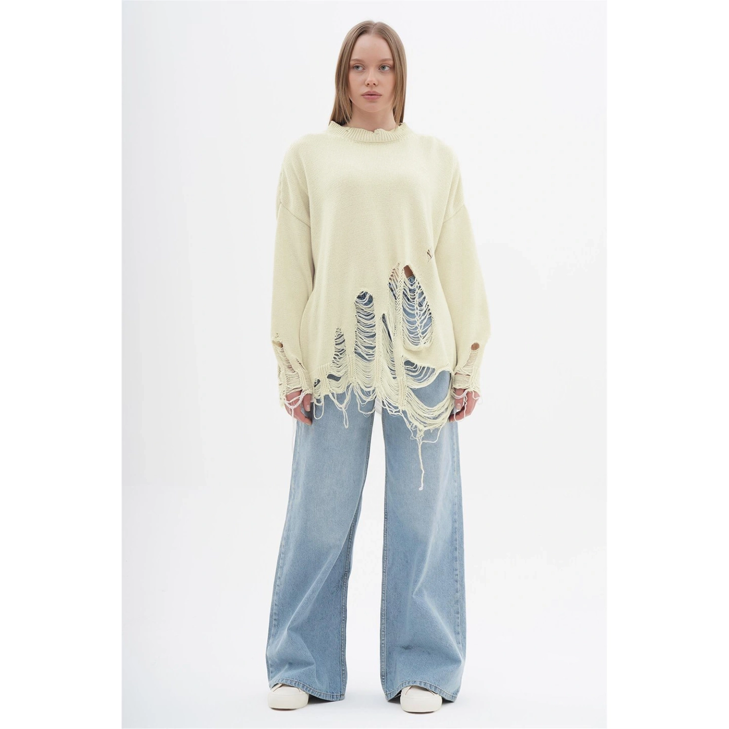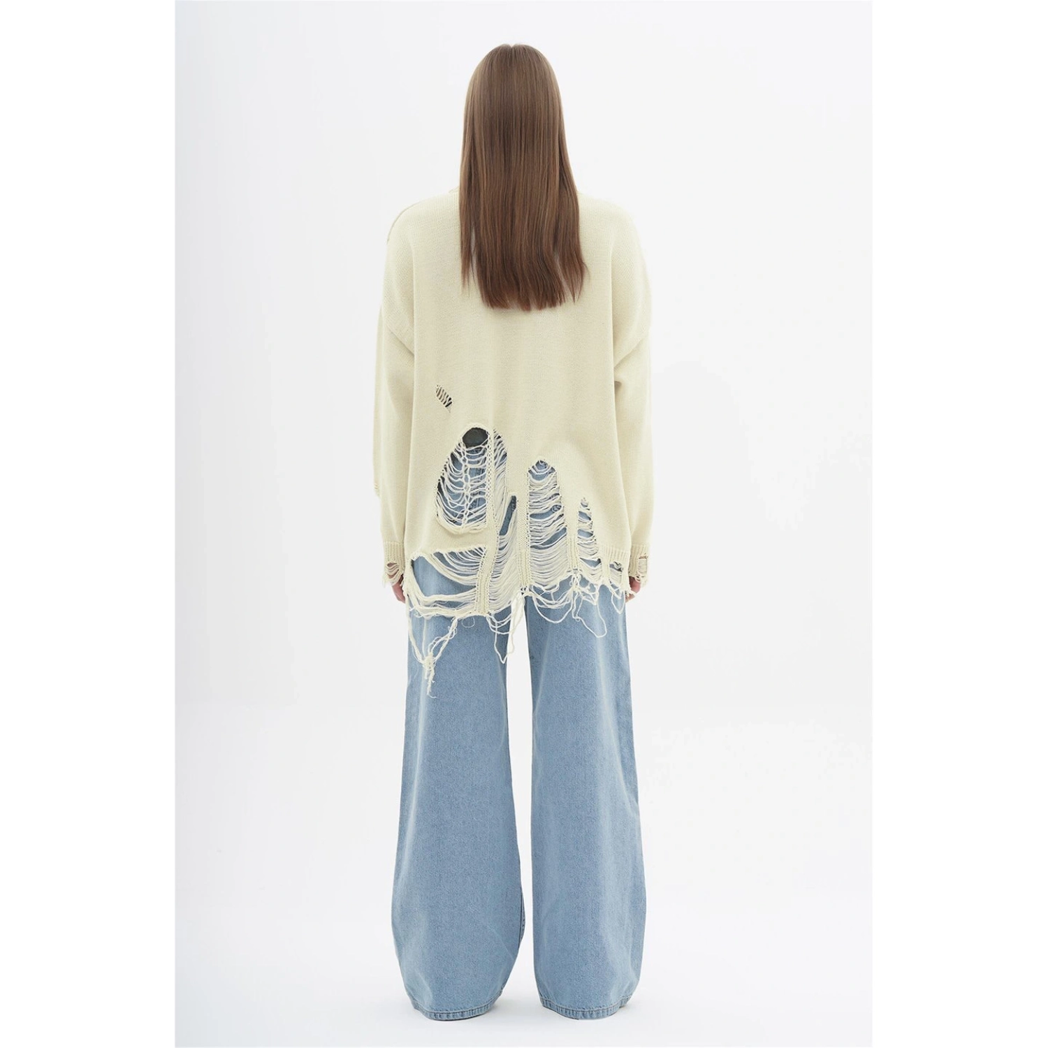 سويت شيرت محبوك واسع بتأثير تمزق من القطن 100%