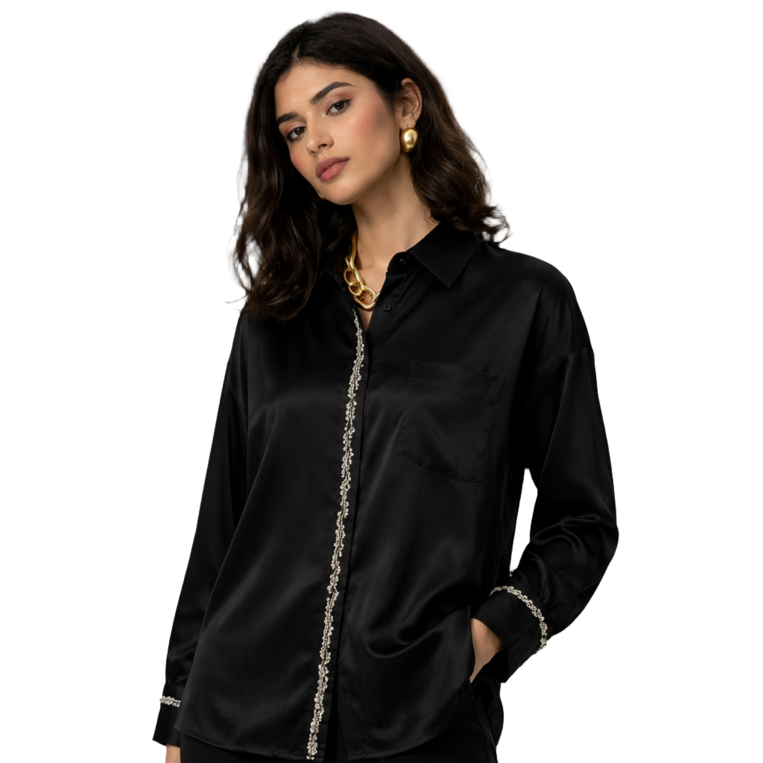 تم تصميم هذا القميص النسائي الفاخر باللون العنابي من خامات عالية الجودة ليبرز بتفاصيل تطريز خرز أنيق في المنتصف وعلى الأكمام. تضيف هذه اللمسات الراقية طابعًا أنيقًا وفخمًا يجعله خيارًا مثاليًا لكل من المناسبات الرسمية والإطلالات اليومية الأنيقة.