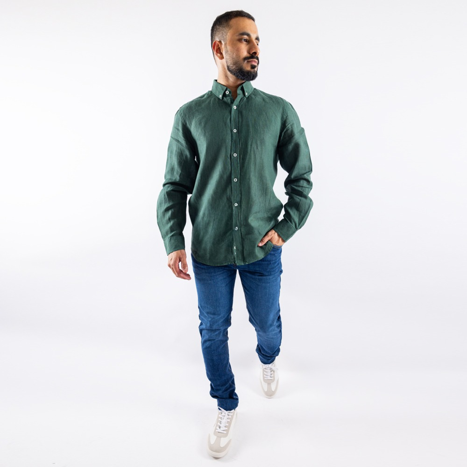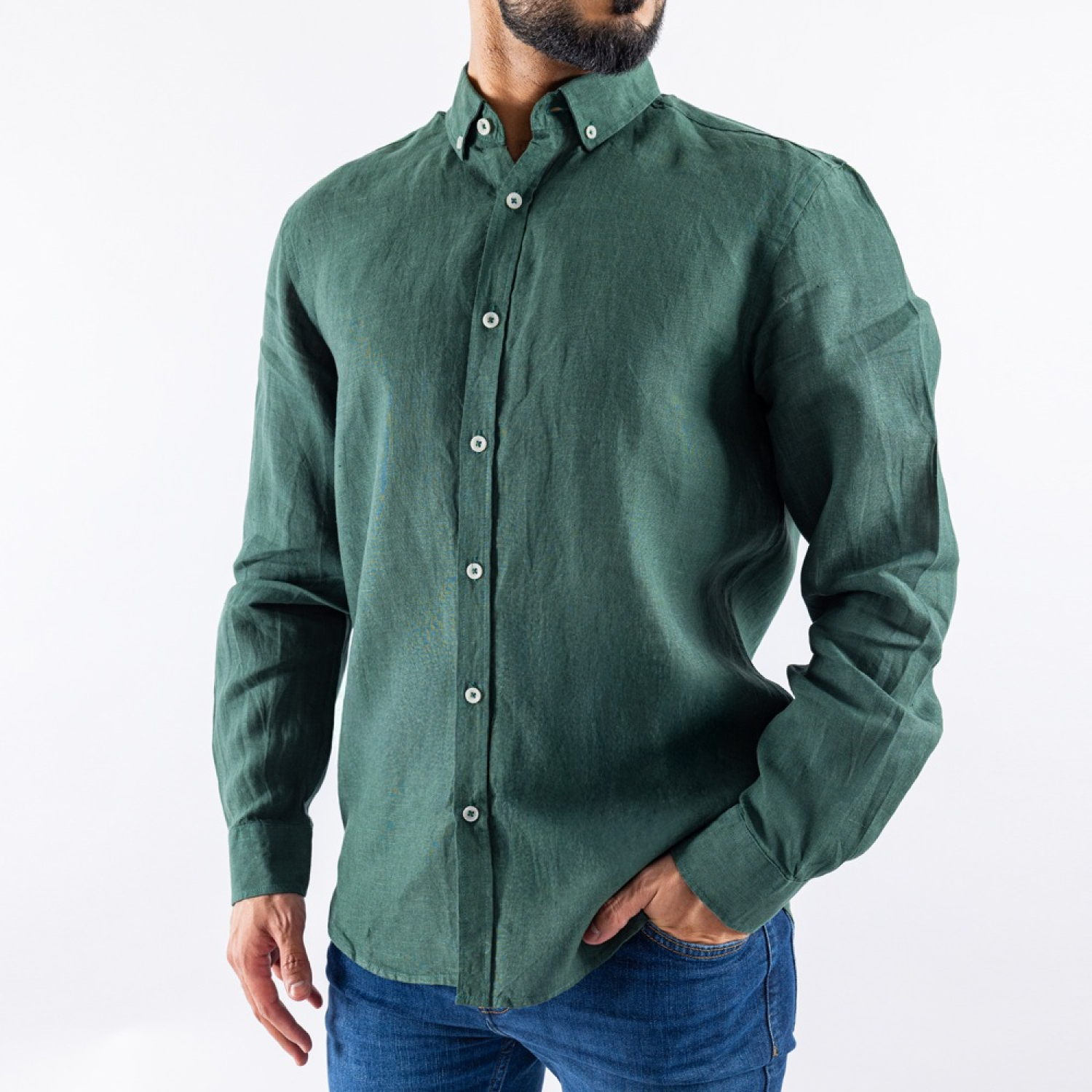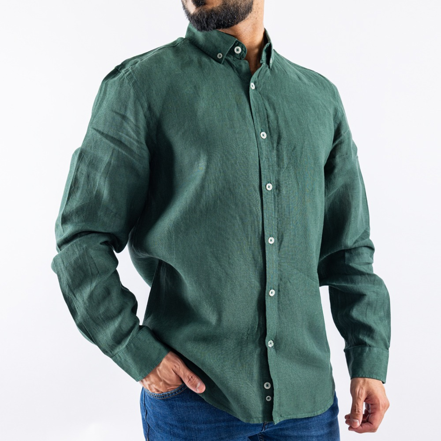 قميص رجالي بأكمام طويلة - قصة عصرية من الكتان - أخضر