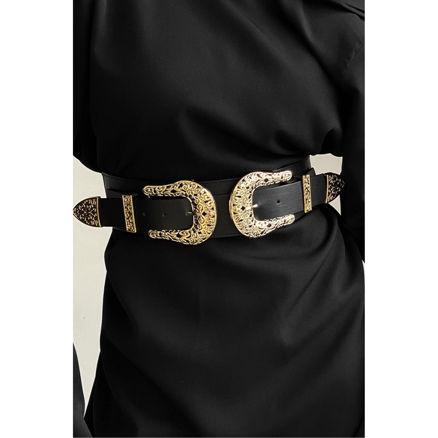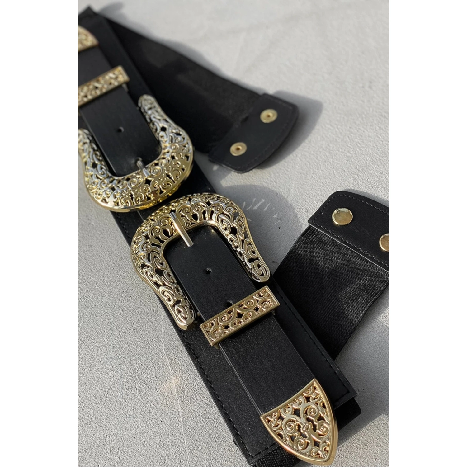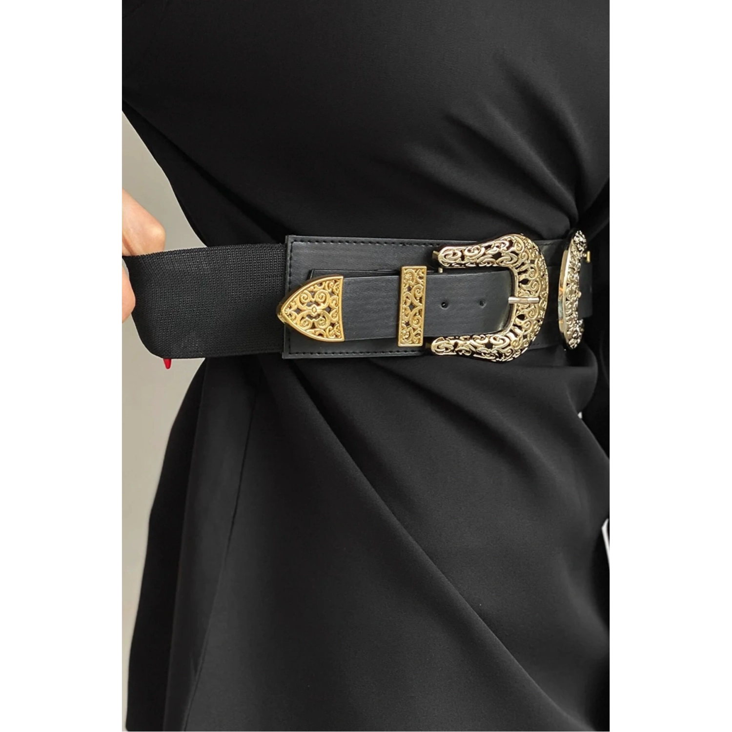 حزام نسائي مرن أسود من الجلد الصناعي بإبزيمين مزدوجين