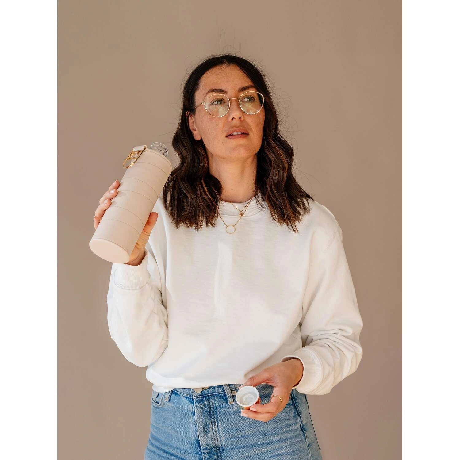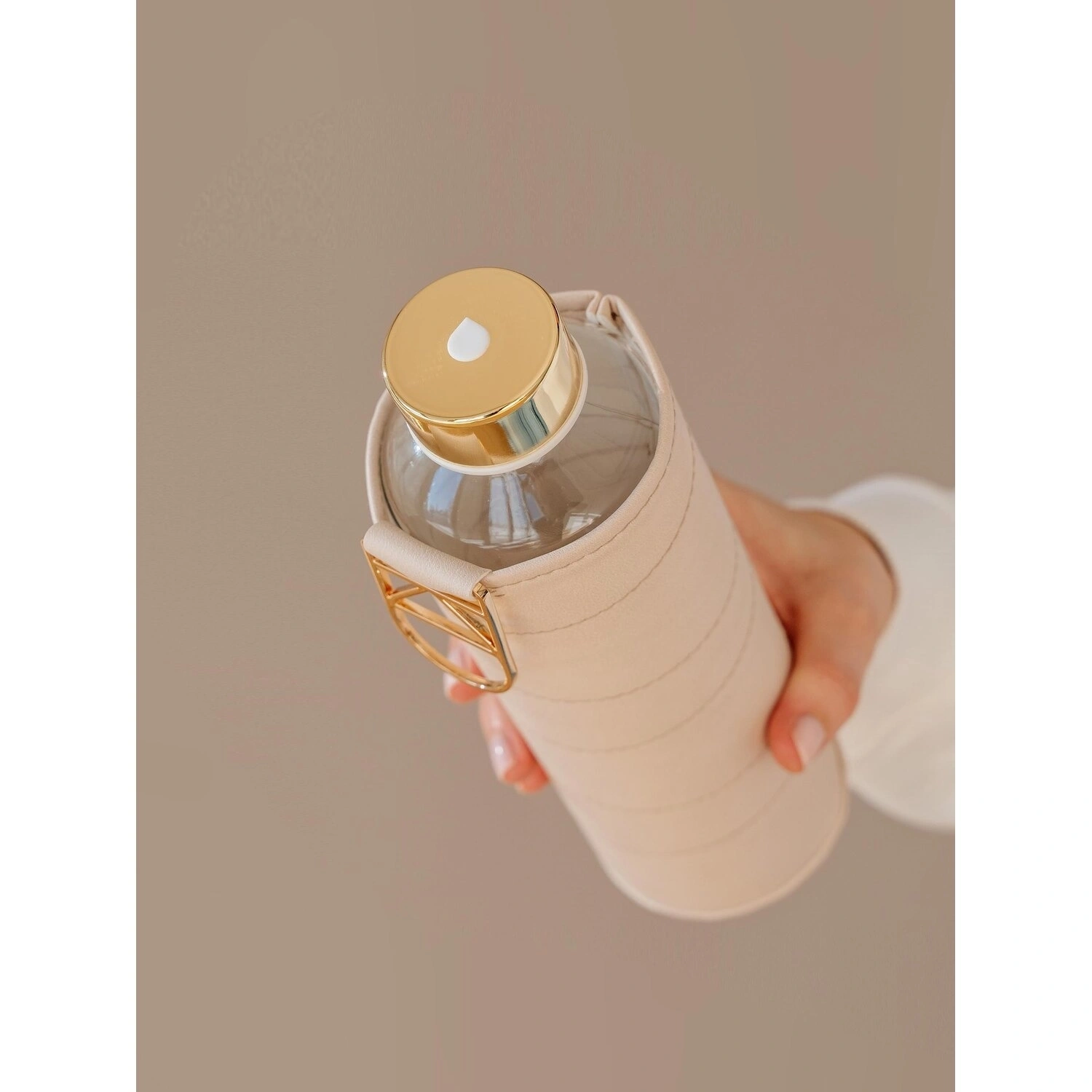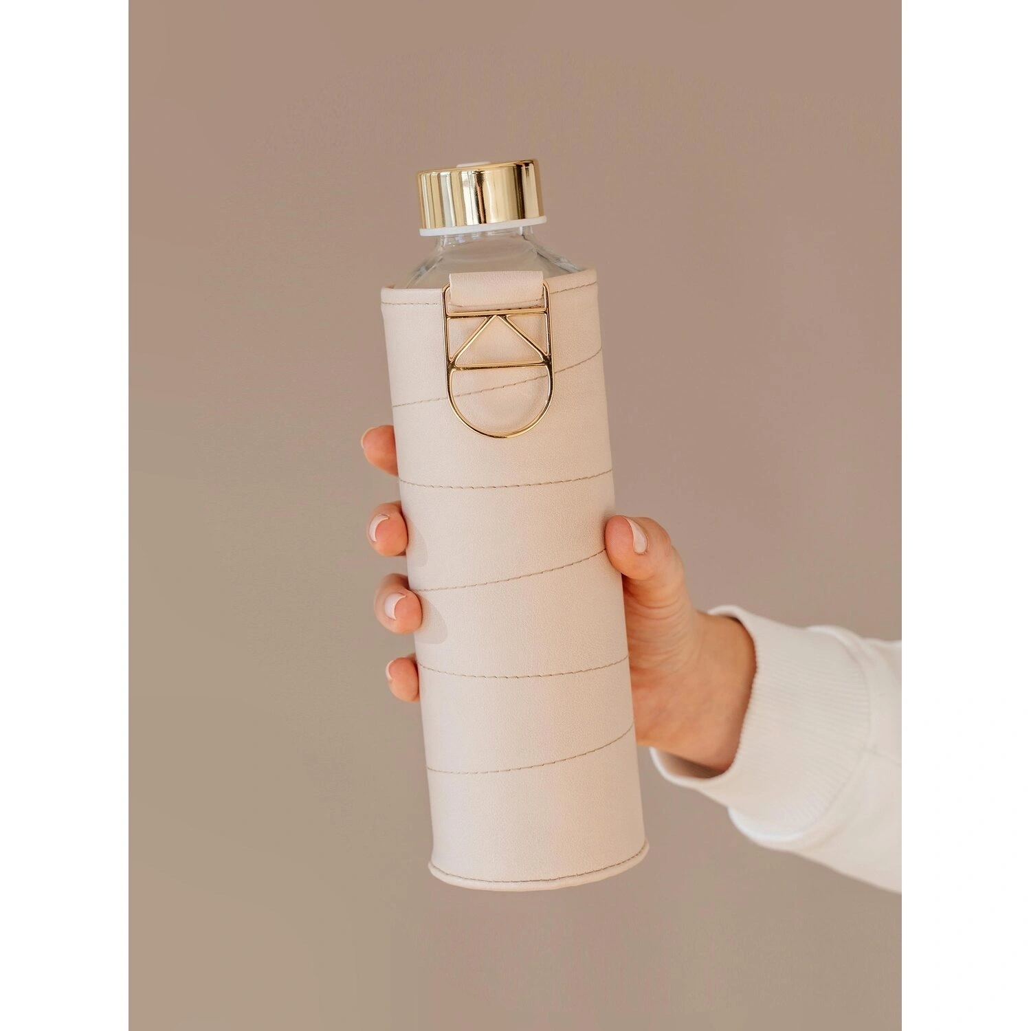 زجاجة فاخرة بسعة 750 مل مصنوعة من الزجاج باللون البيج. متينة وأنيقة، مثالية لحمل المشروبات بأناقة في المنزل أو المكتب أو أثناء التنقل.