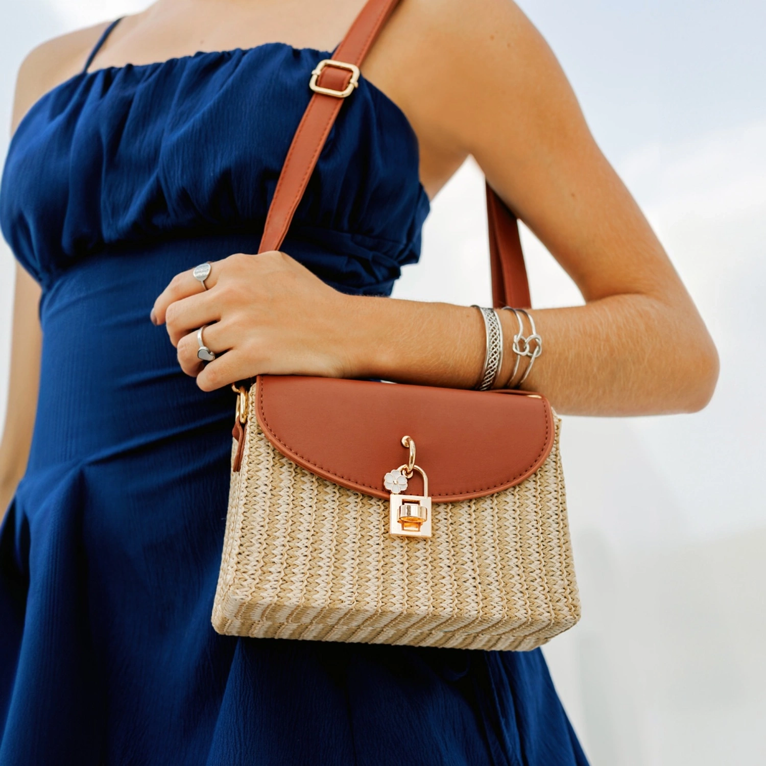 حقيبة ميكونوس بلوم سترو ذات المقبض العلوي تجمع بين الأناقة والرقي بفضل هيكلها المصنوع من القش المنسوج، وحوافها الجلدية الصديقة للبيئة، وقفلها المميز. تتميز هذه الحقيبة الصغيرة والأنيقة بمقبض علوي متين وحزام قابل للإزالة، مما يسمح بحملها كحقيبة كروس لمزيد من التنوع. يُضفي قفلها القابل للطي وتصميمها الأنيق لمسةً مميزة على أي إطلالة صيفية. متوفرة بثلاثة ألوان: الأبيض اللؤلؤي، والبني الداكن، والبرتقالي الغروب، وهي مصممة لتتناسب بسهولة مع الإطلالات المحايدة والقطع الملونة. يبلغ حجمها 19 × 13.5 سم، وهي مثالية لحمل أغراضك الأساسية وإضفاء لمسة أنيقة من النهار إلى الليل.