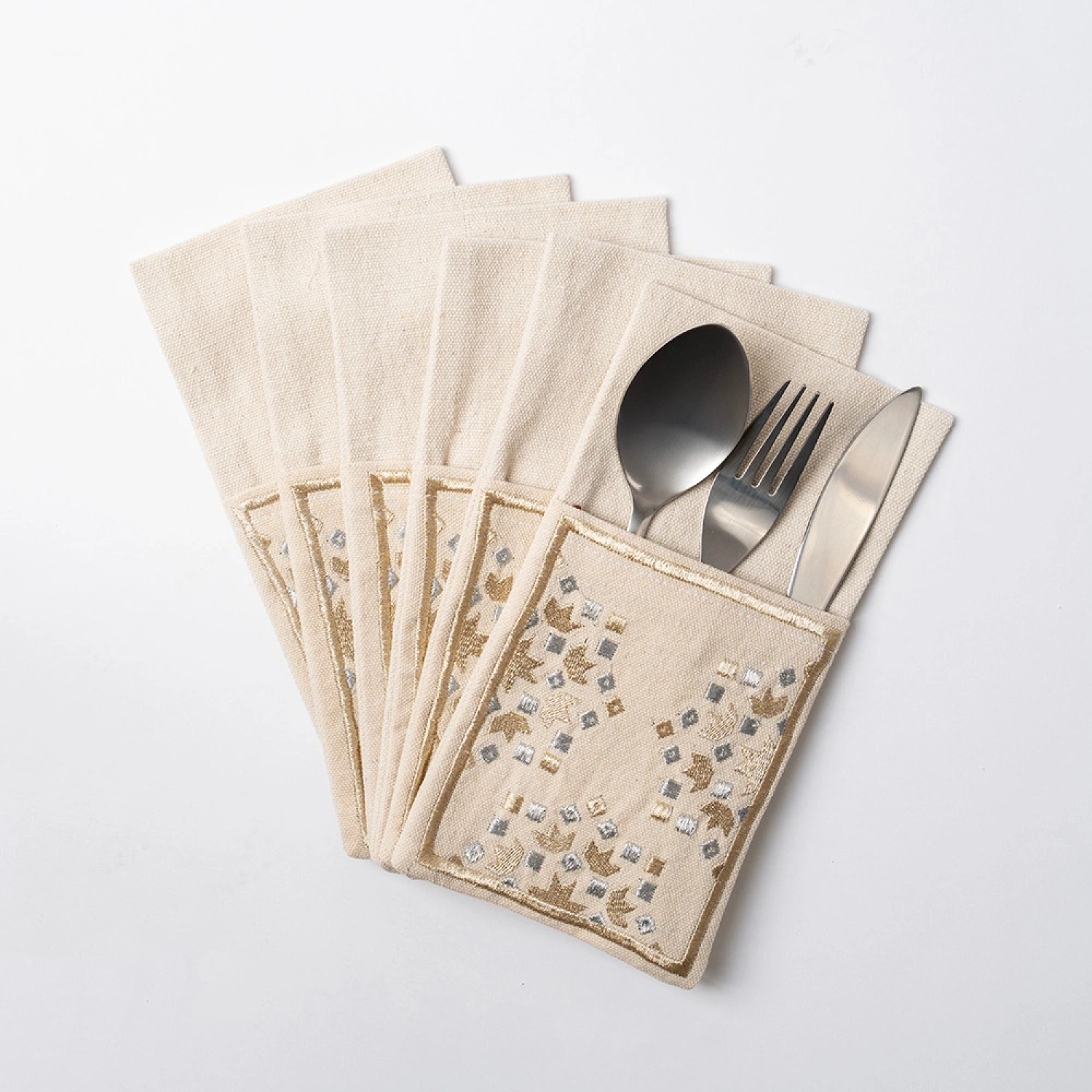 طقم أغطية أدوات المائدة (شوكة، ملعقة، سكين) مزين بتطريز ذهبي وفضي، مثالي لترتيب الطاولة في المناسبات الخاصة.