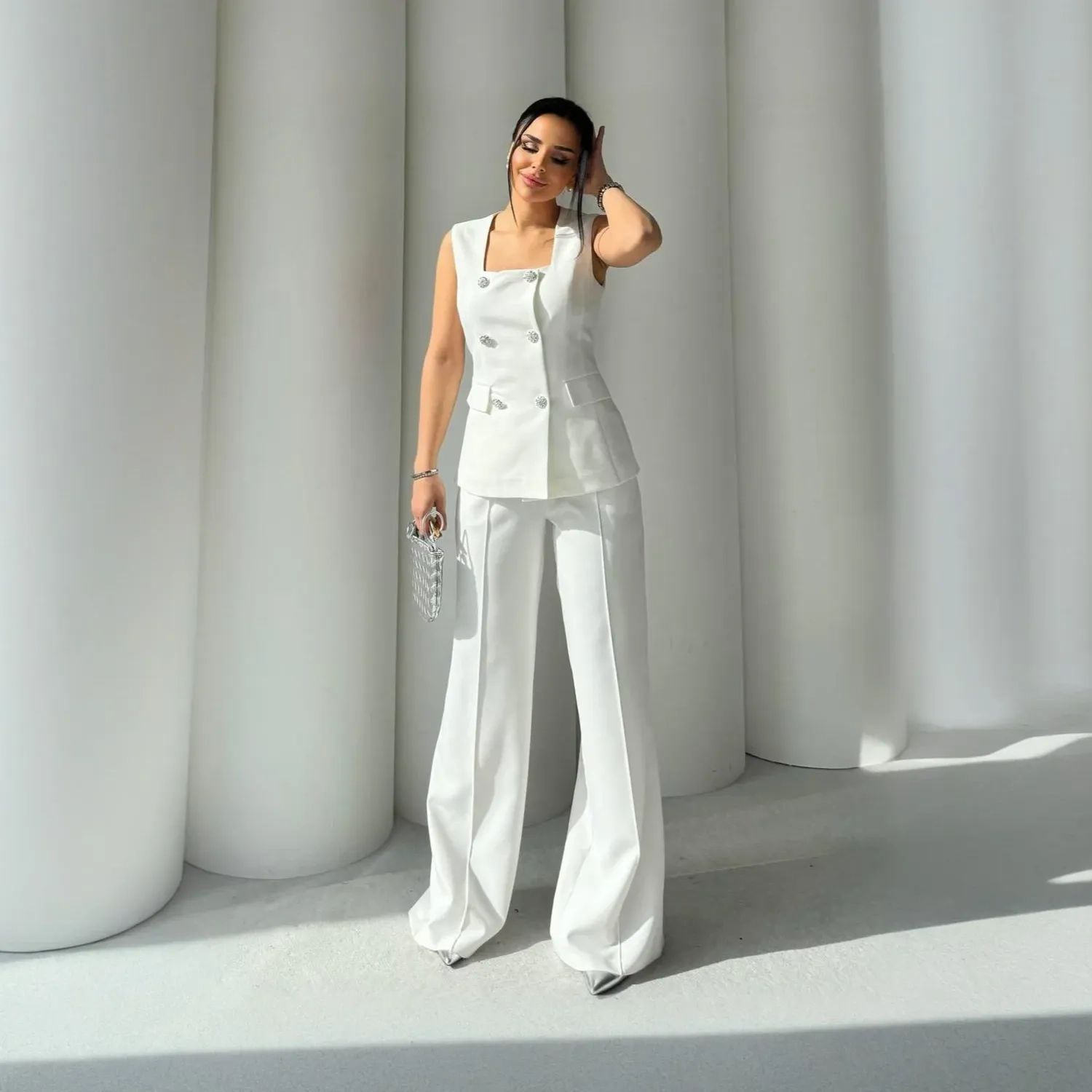 التفاصيل: فيست بدون أكمام، أزرار أنيقة، بنطلون بقصّة مصممة، طقم متناسق