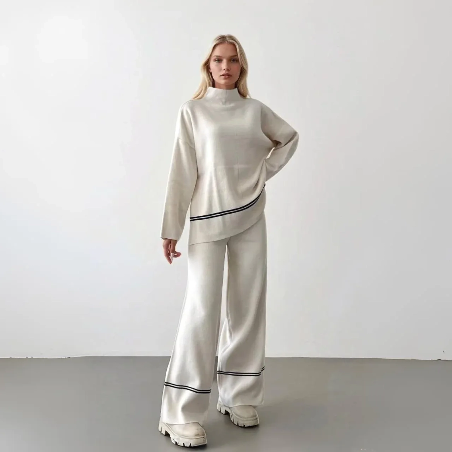 طقم نسائي عصري من التريكو بياقة عالية وقماش ناعم وقصة مريحة