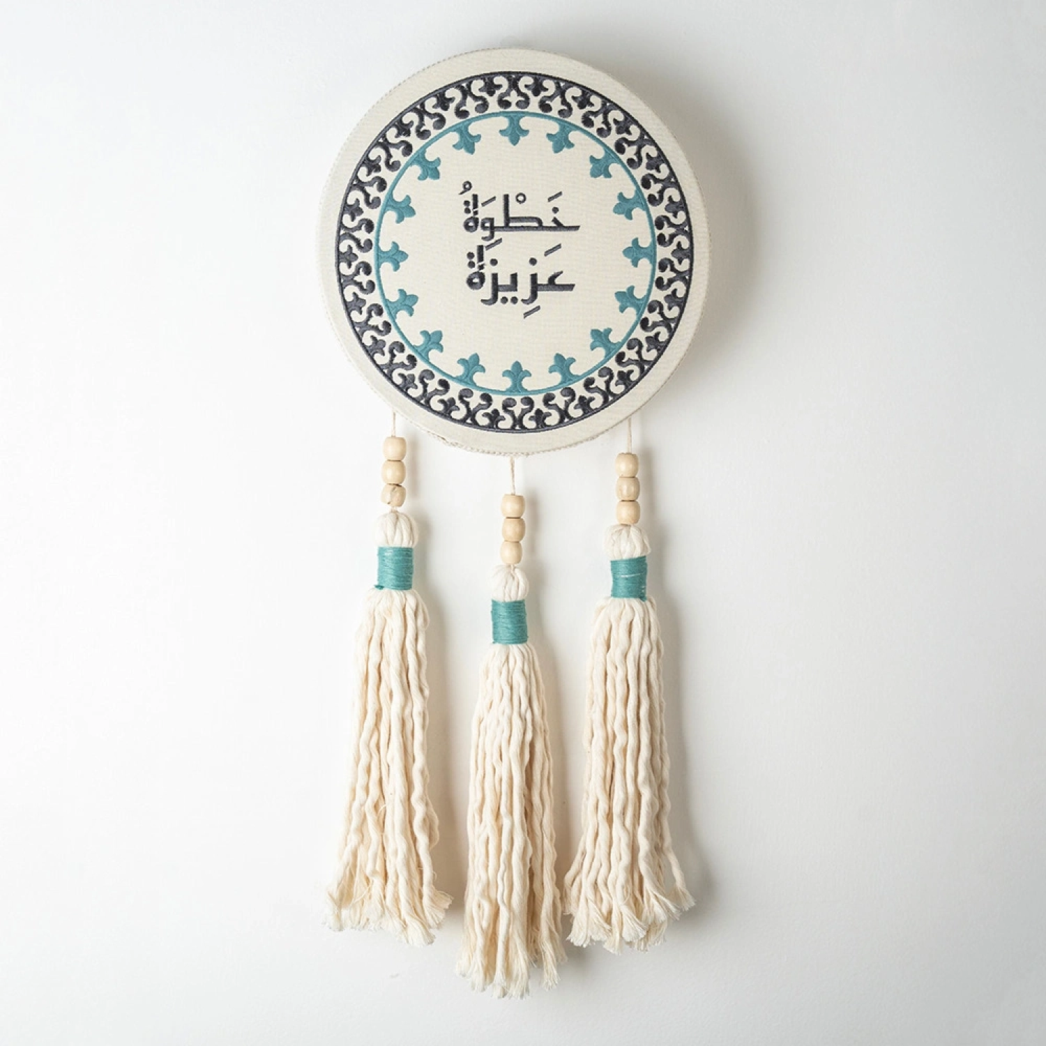 تعليقة جدارية أنيقة بلمسات شرقية تحمل عبارة “خطوة عزيزة”، مصنوعة من خامات فاخرة مع تفاصيل مزخرفة مستوحاة من الفن الإسلامي. تتميز بتصميم دائري مزين بنقوش هندسية جذابة، مع شرّابات قطنية متدلية تضيف لمسة من الدفء والجمال لديكور المنزل. مثالية لاستقبال الضيوف بروح الترحيب والأصالة.