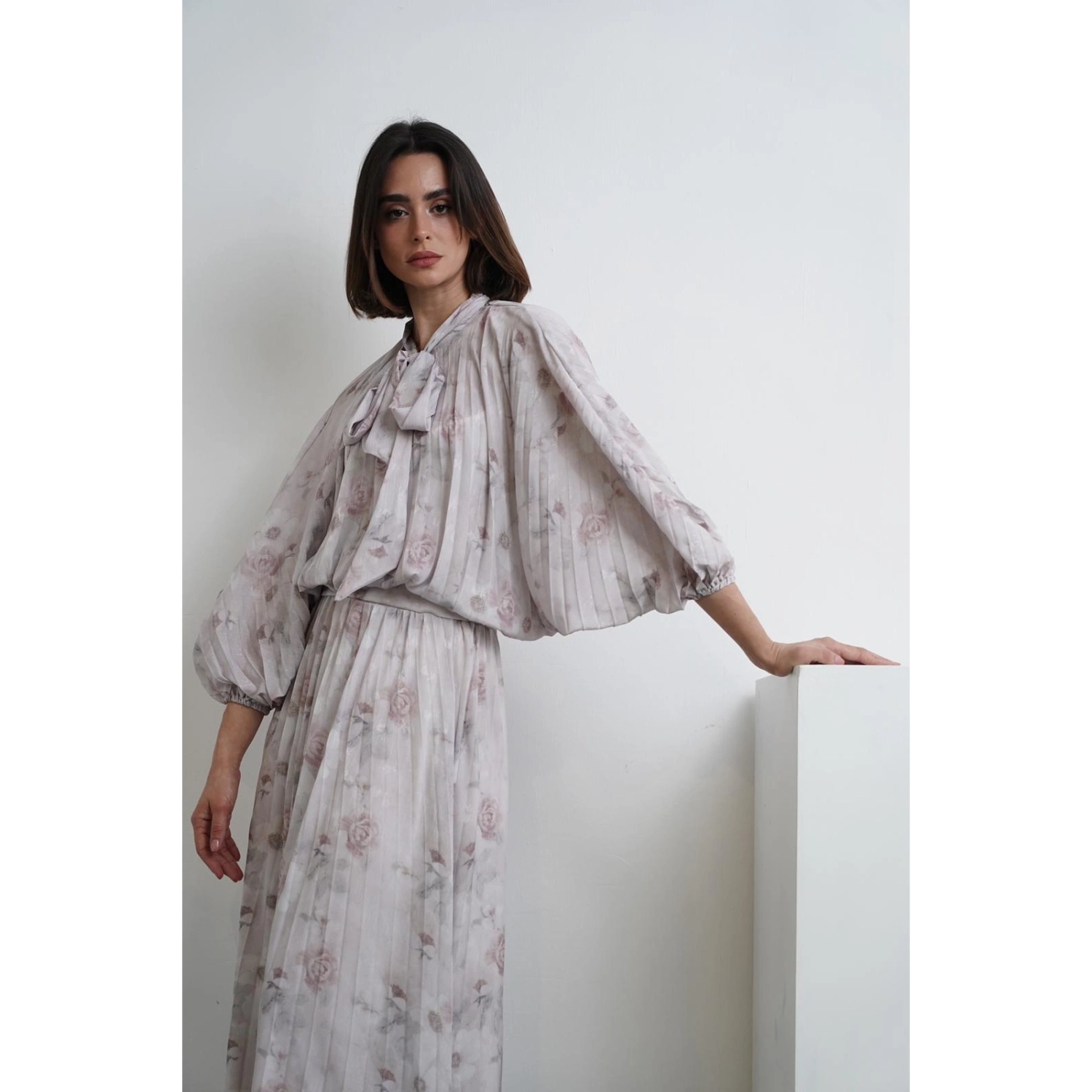 قميص بليسيه مزخرف بأزهار - رمادي