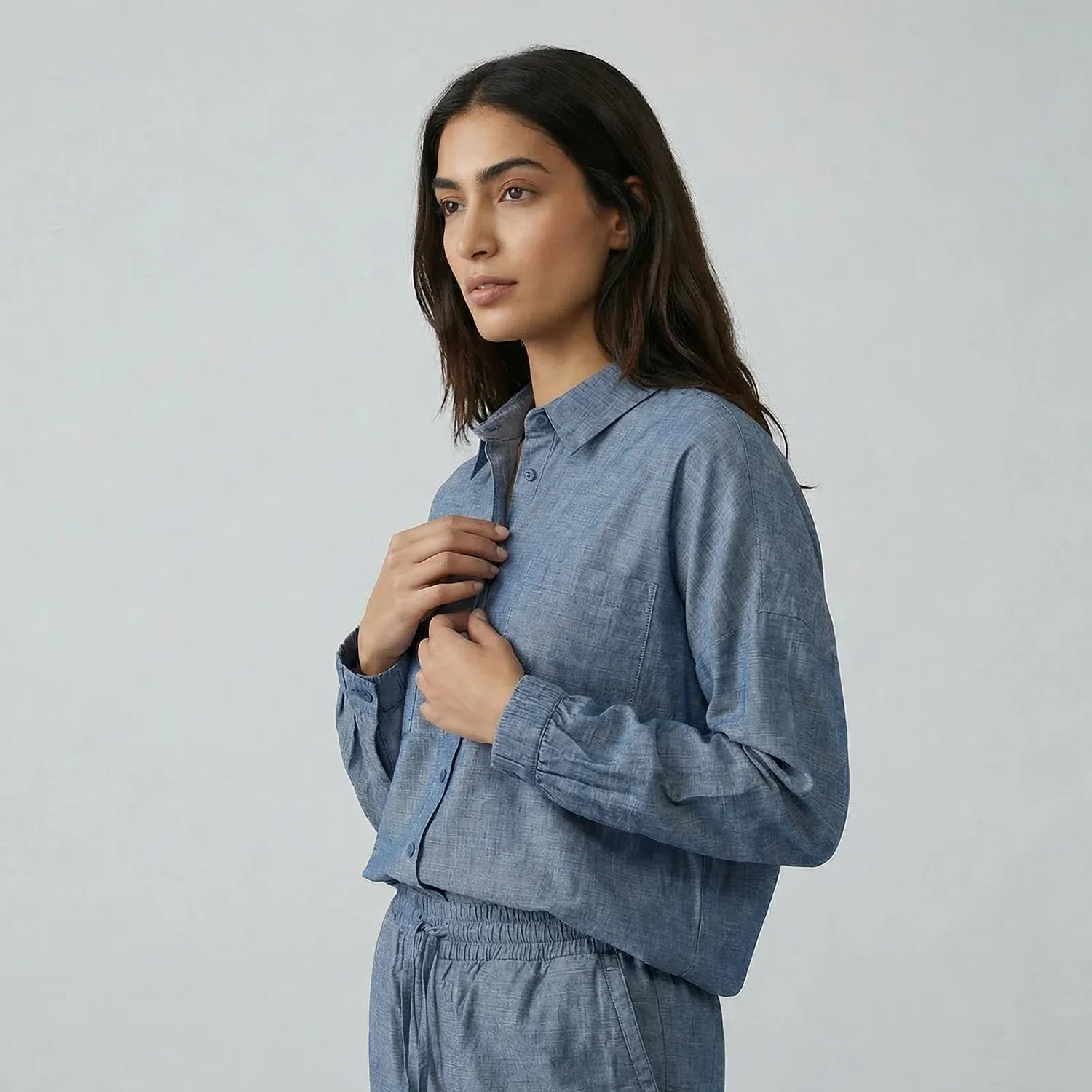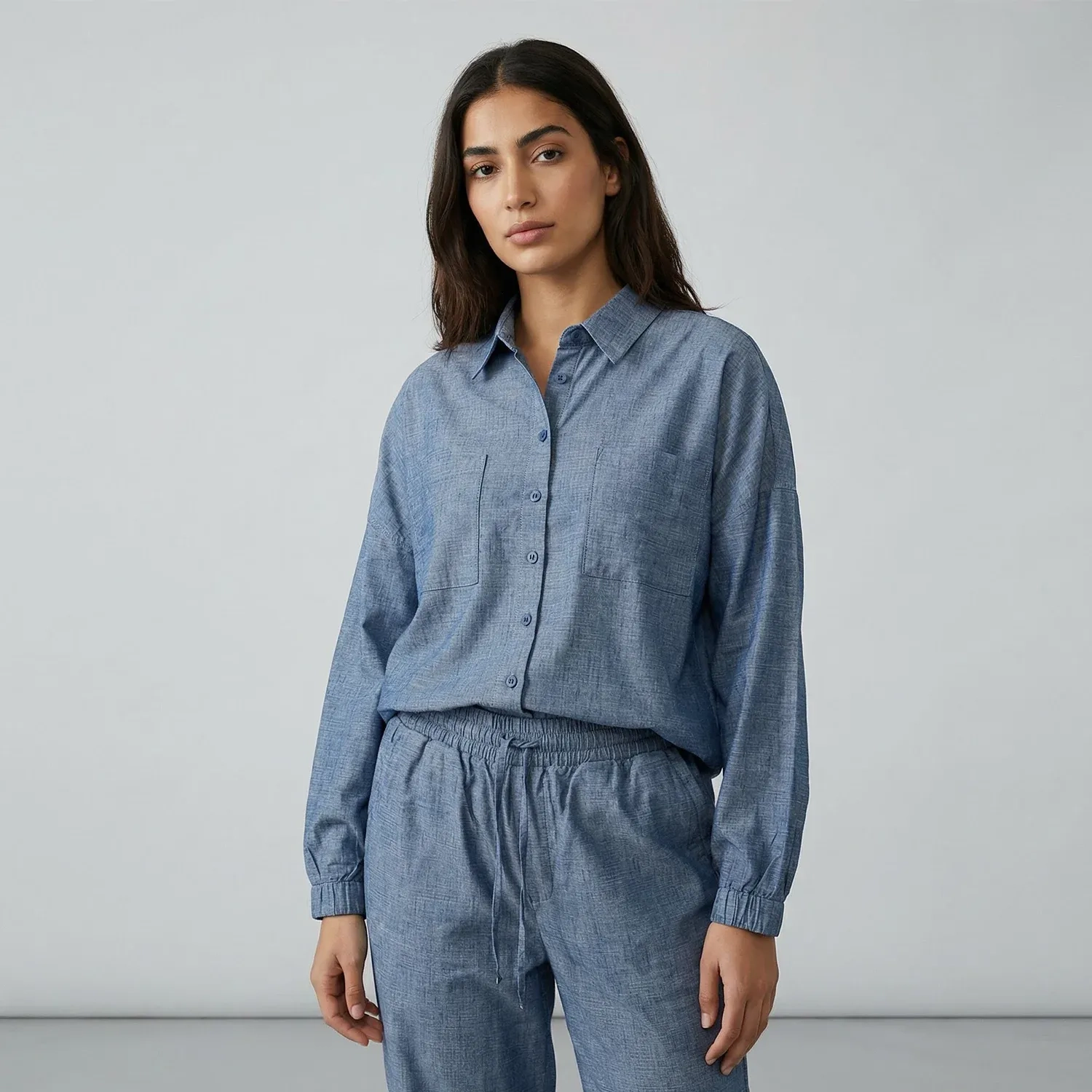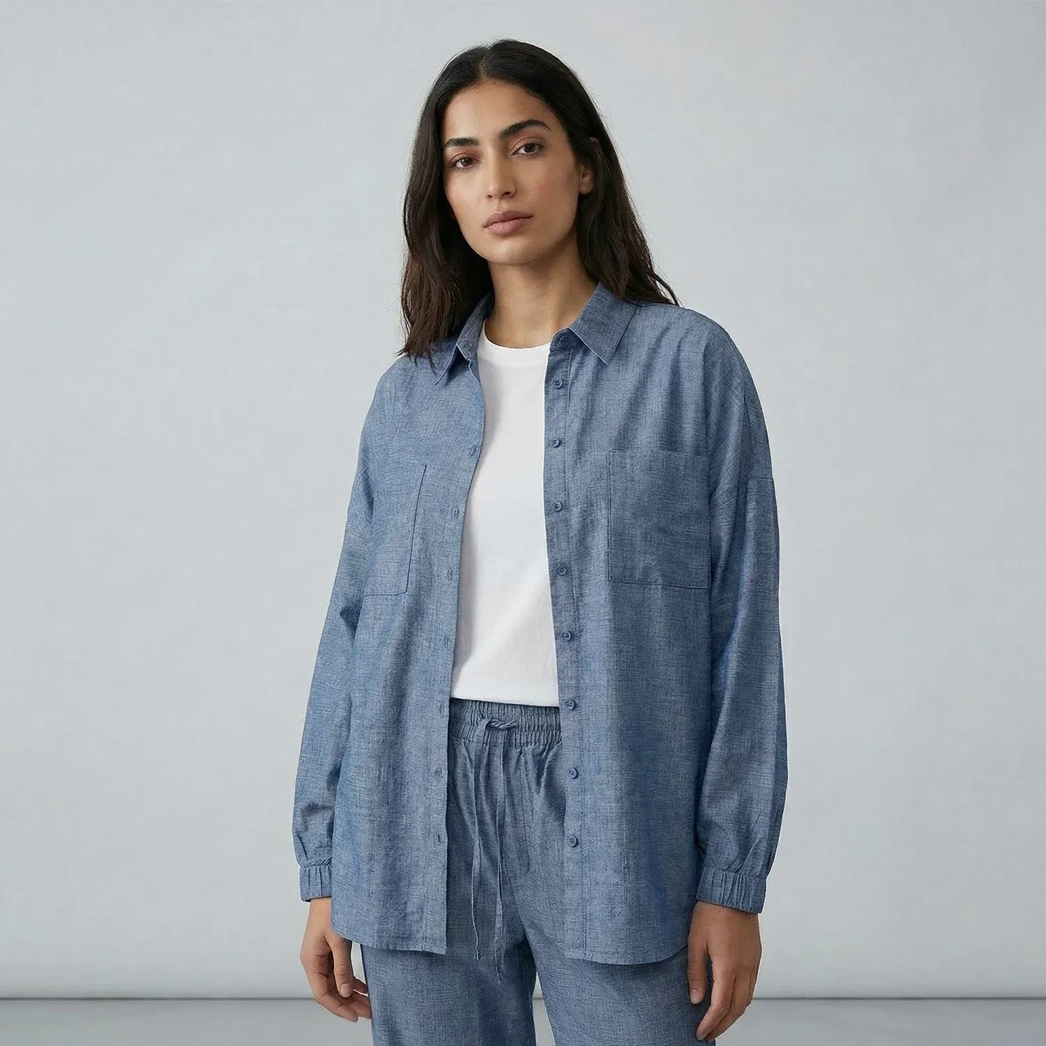 تم تصميم هذا القميص الدنيم الأزرق بقصة فضفاضة ليمنحك راحة وإطلالة يومية أنيقة وسهلة. يتميز بـ ملمس دنيم ناعم وقصّة نظيفة وبسيطة، مما يجعله مثالياً للإطلالات الكاجوال والكاجوال الذكية. يمكن ارتداؤه بمفرده أو مع البنطلون المطابق لإطلالة دنيم منسقة وعصرية.