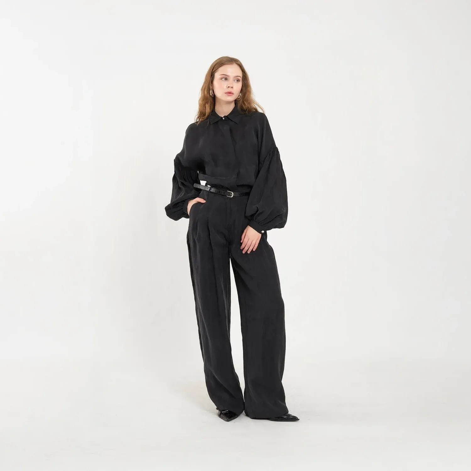 أعيدي تعريف التنسيق العصري مع هذا الطقم المذهل المكون من قطعتين بأكمام الفانوس (Lantern-Sleeve). صُمم هذا الطقم مع التركيز على الحجم والانسيابية، ويتميز بقميص راقٍ بأزرار وأكمام منحوتة وجريئة، منسق مع بنطال واسع الأرجل بانسدال مثالي. يقدم هذا الطقم مزيجاً سلسلاً بين التصميم المبتكر والأناقة التي لا تضاهى، مما يجعله خياراً مثالياً لإطلالات العمل الراقية أو المناسبات المسائية الفاخرة.