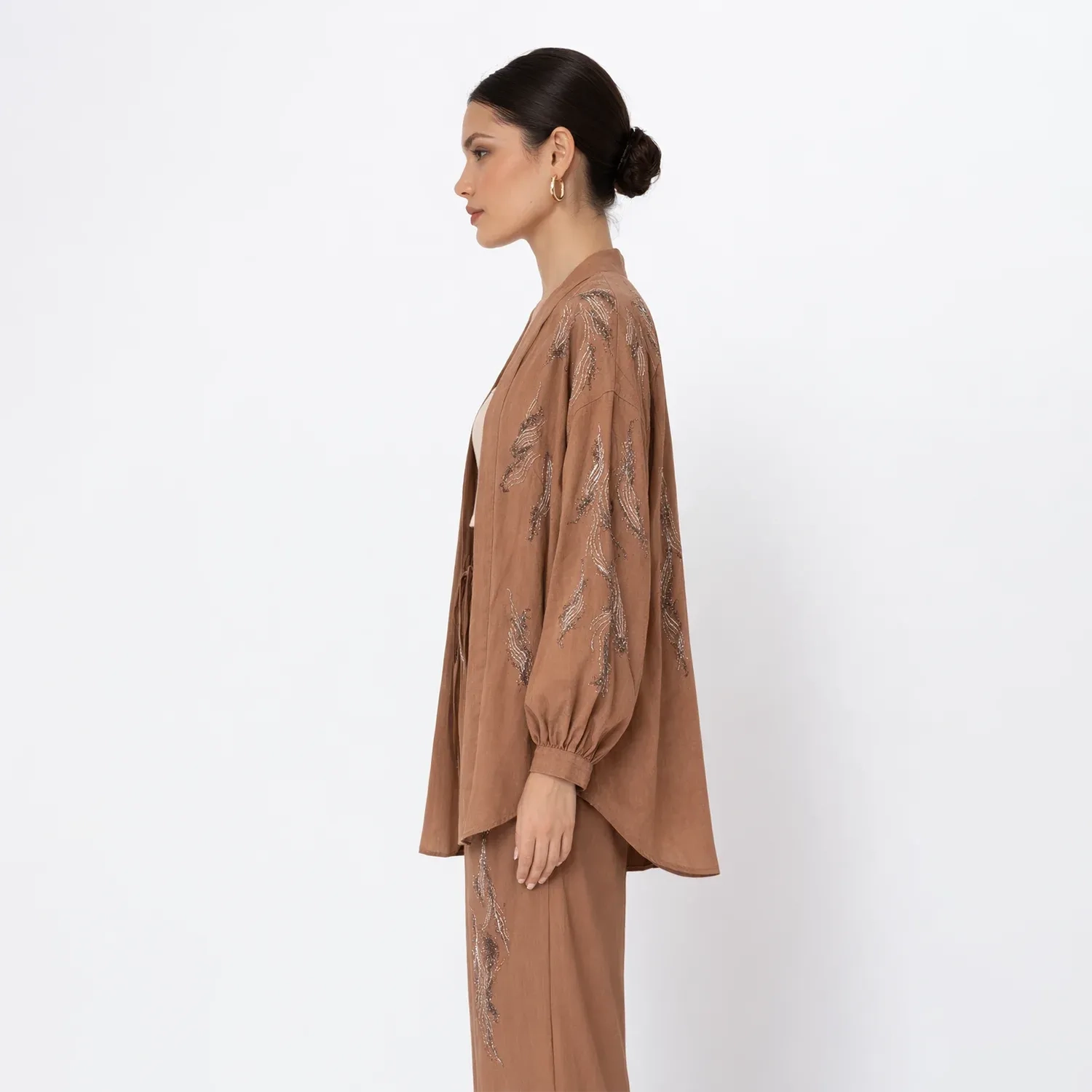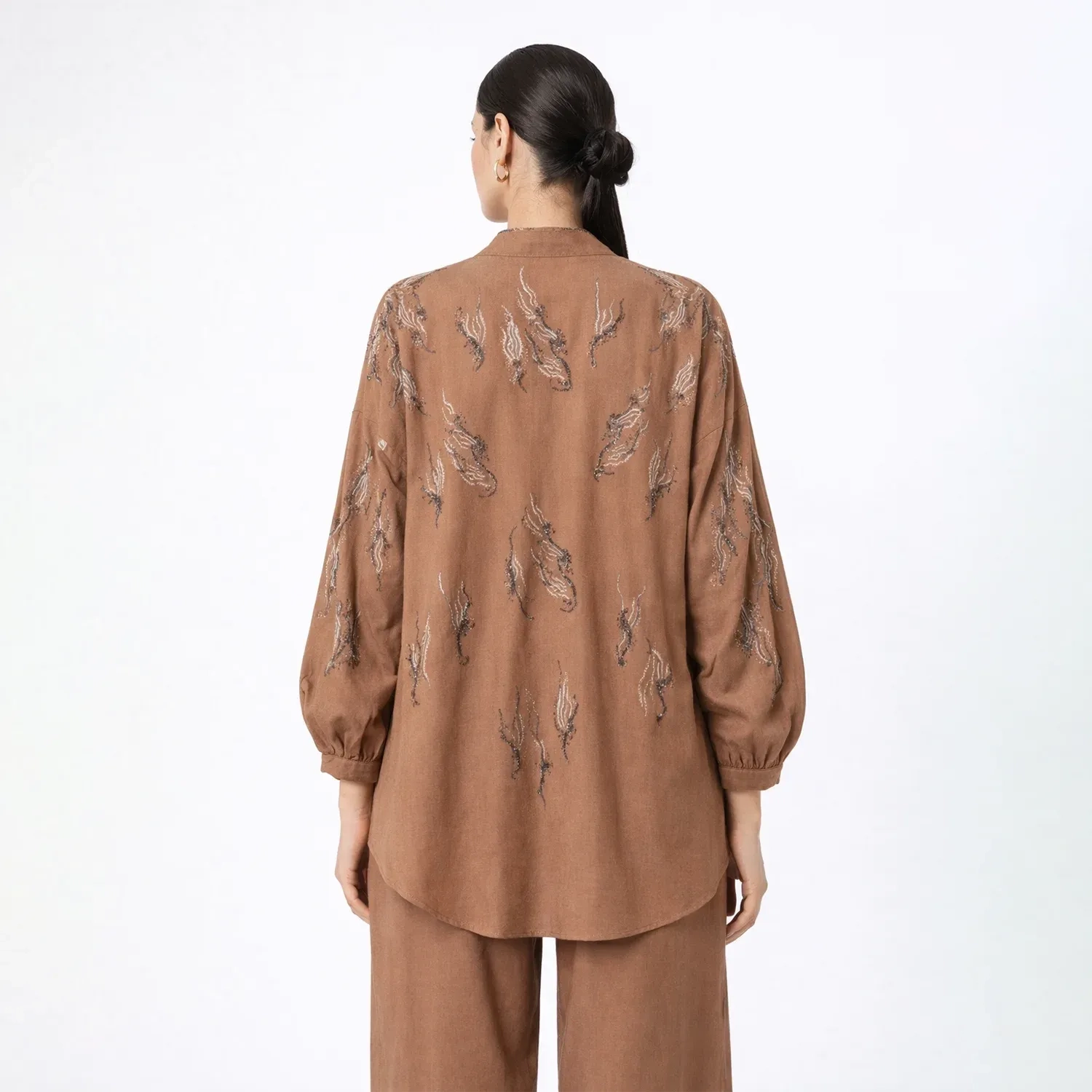 تتميز هذه البلوزة بـ نقش أسود متموج فريد يضيف لمسة عصرية على الخلفية الرملية الكلاسيكية. يمنحها القصّة الفضفاضة والواسعة مظهرًا جذابًا لجميع أنواع الأجسام، بينما تضيف الأكمام المجمعة لمسة نظيفة وأنيقة عند المعصمين.
