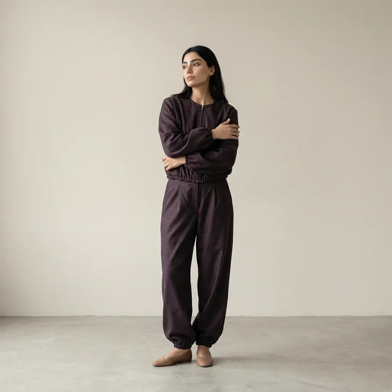 يأتي الطقم مع بنطال مطابق بخصر عالٍ وأرجل واسعة، ليقدم قواماً انسيابياً وقصة مريحة مثالية للحياة اليومية المعاصرة. خيار مثالي للسفر، الاسترخاء، أو الخروجات الكاجوال الأنيقة.