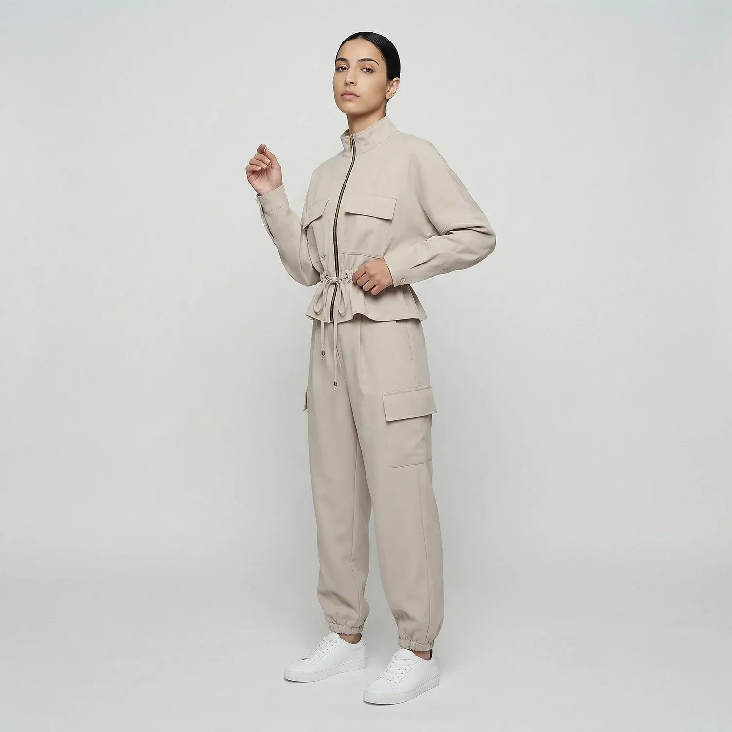 طقم جاكيت وبنطال كارجو نسائي مريح وعملي، مثالي للارتداء اليومي وإطلالة أنيقة ومريحة