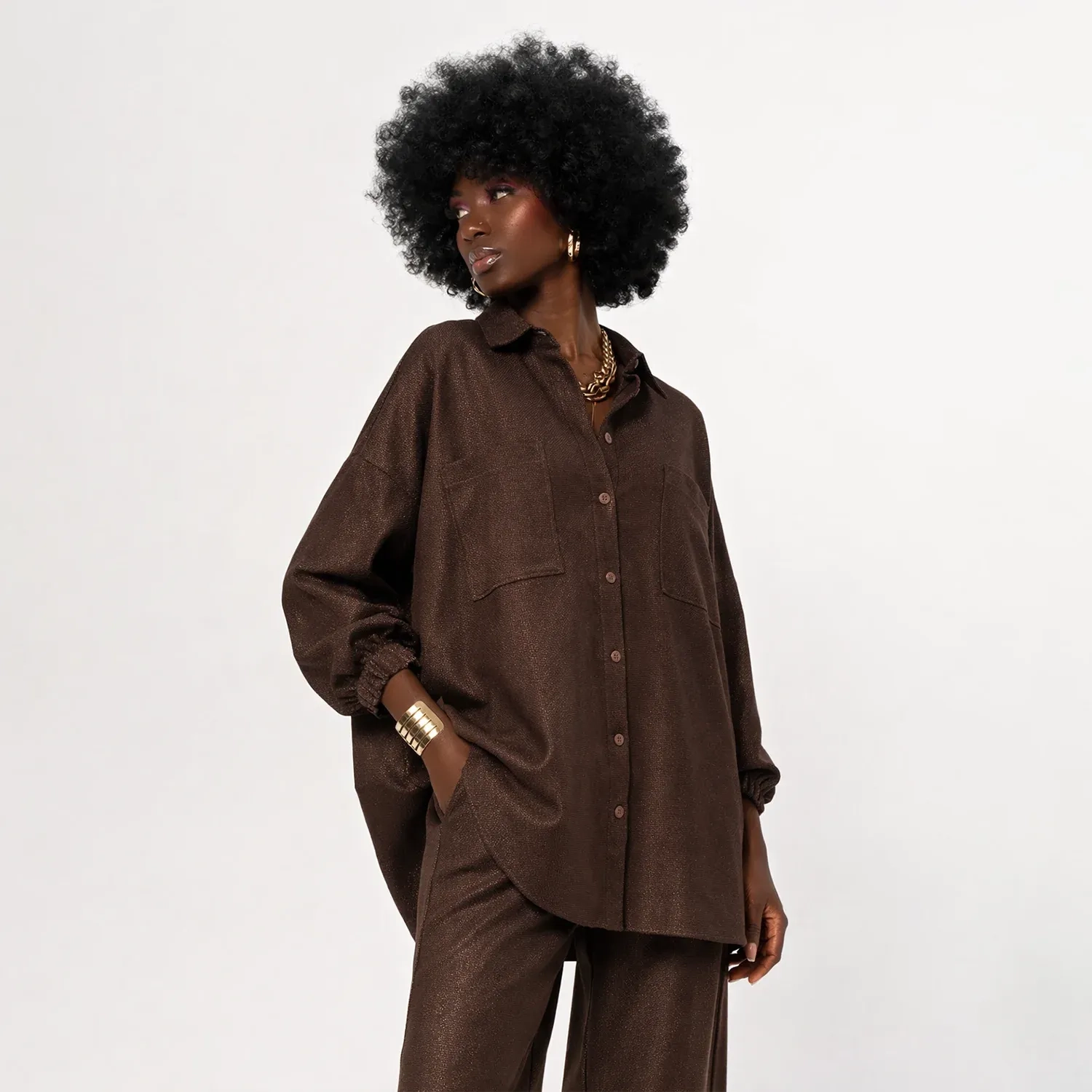 تم تصميم هذا الجاكيت النسائي الخفيف باللون البني القهوة ليضيف لمسة أنيقة وراقية إلى إطلالتك. يتميز بـ أزرار أمامية جميلة و قصة عصرية ونظيفة تجمع بين الراحة والأناقة اليومية.