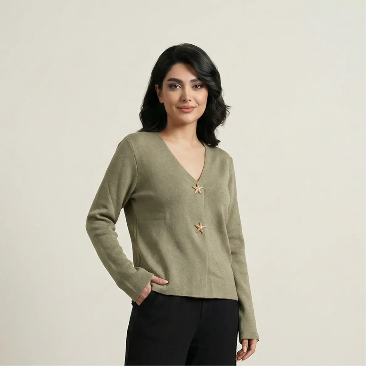 توب نسائي ضيق أنيق –بياقه على شكل V وأزرار مزخرفة على شكل نجمة، مثالية للإطلالات اليومية الكاجوال والرسمية