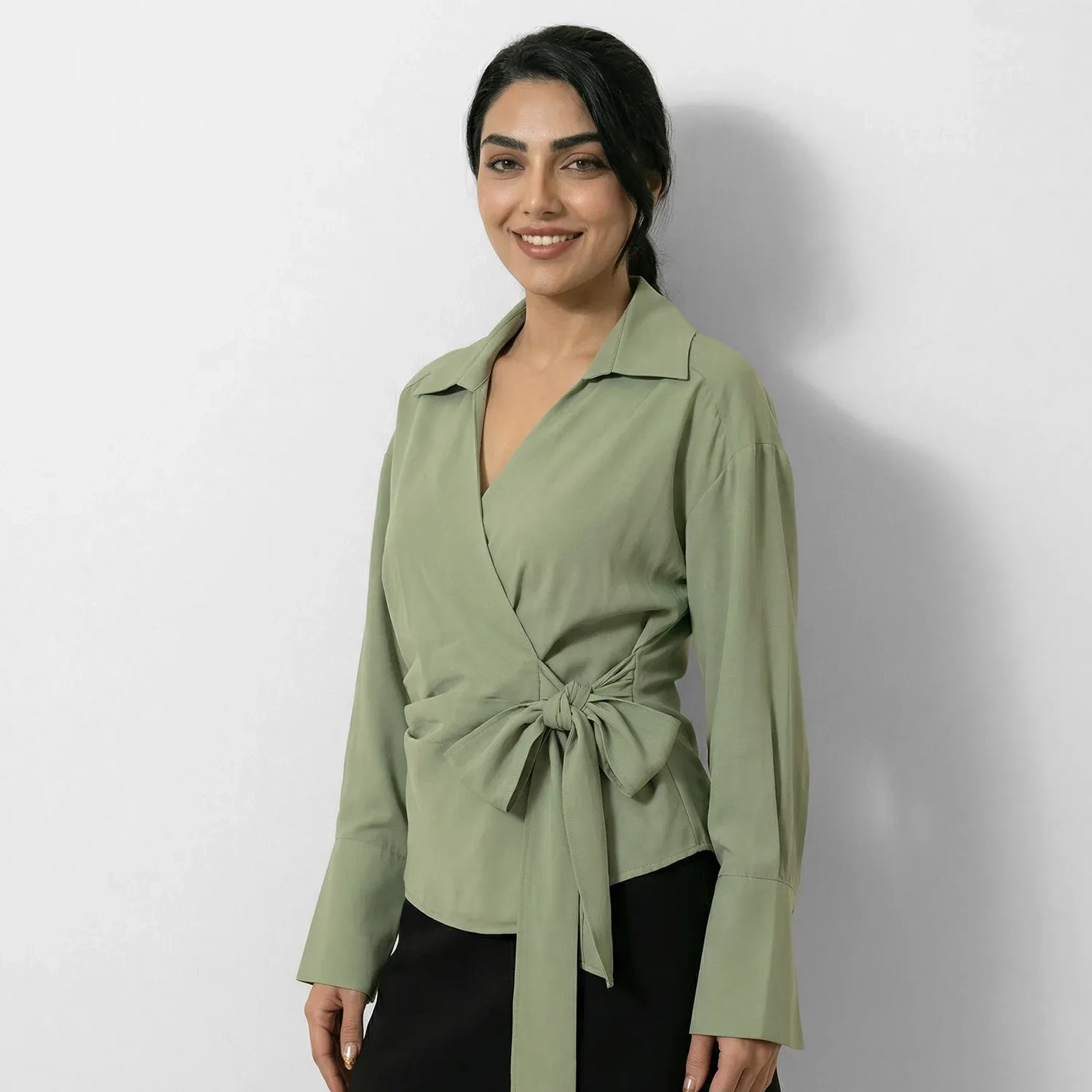 صُمم هذا القميص ذو الأكمام الطويلة برباط أمامي ليضفي لمسة ناعمة وأنيقة على إطلالاتك اليومية والعصرية. يتميز بتصميم أمامي ملفوف أنيق مع رباط جانبي، مما يخلق قوامًا رائعًا مع الحفاظ على الراحة وسهولة الارتداء. بفضل قصته البسيطة وخفة وزنه، يُعد مثاليًا للتنسيق مع البناطيل الرسمية، أو الجينز، أو التنانير. قطعة أنيقة ومتعددة الاستخدامات تُضفي لمسة راقية على ملابسك بكل سهولة.