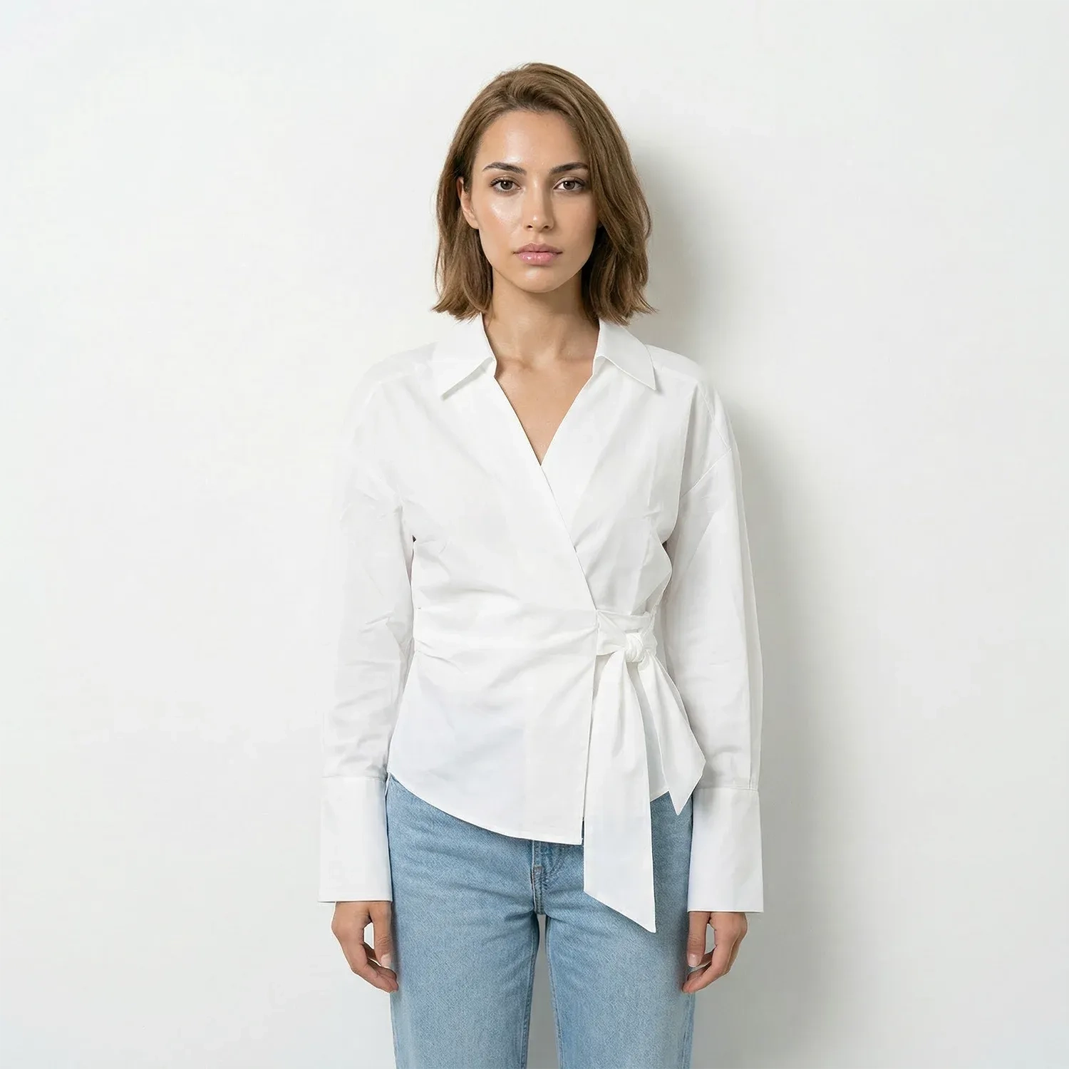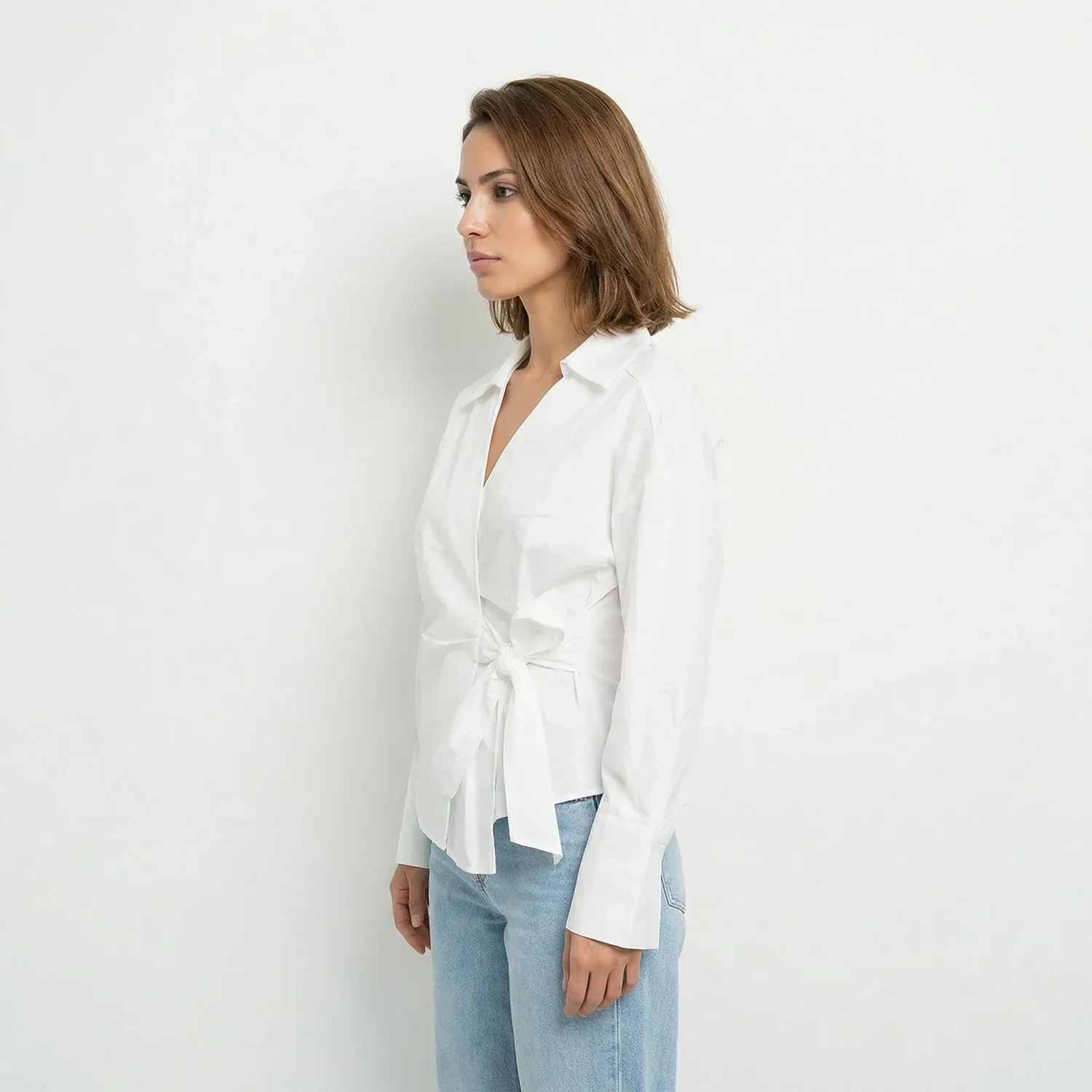 صُمم هذا القميص ذو الأكمام الطويلة برباط أمامي ليضفي لمسة ناعمة وأنيقة على إطلالاتك اليومية والعصرية. يتميز بتصميم أمامي ملفوف أنيق مع رباط جانبي، مما يخلق قوامًا رائعًا مع الحفاظ على الراحة وسهولة الارتداء. بفضل قصته البسيطة وخفة وزنه، يُعد مثاليًا للتنسيق مع البناطيل الرسمية، أو الجينز، أو التنانير. قطعة أنيقة ومتعددة الاستخدامات تُضفي لمسة راقية على ملابسك بكل سهولة.