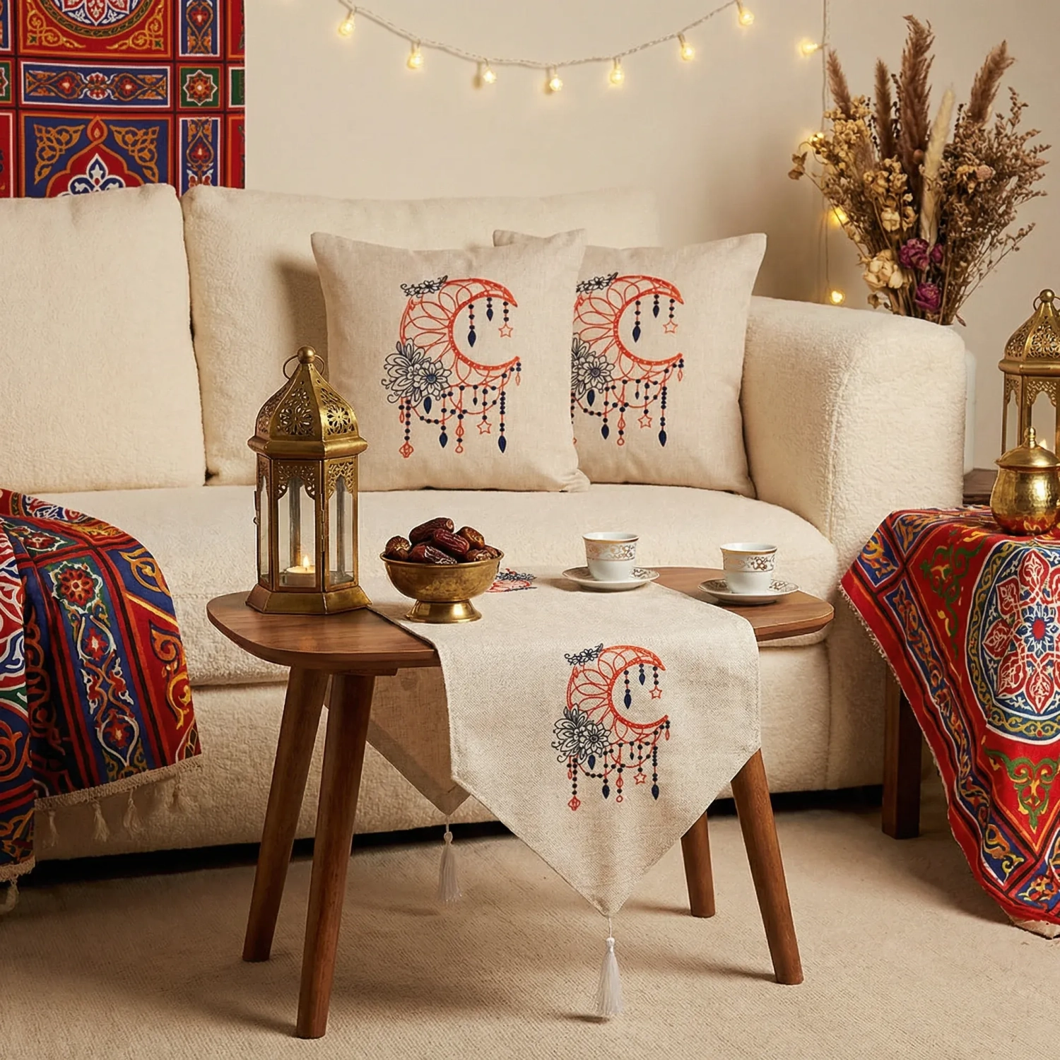 This decorative textile set includes one embroidered table runner and two matching cushion covers. Crafted from beige fabric, the pieces feature a striking red crescent motif accented with black and red hanging ornaments and intricate floral details. The design blends festive artistry with cultural symbolism, making it perfect for Ramadan and Eid décor. Ideal for dining tables and seating areas, this set adds elegance, warmth, and a celebratory spirit to your home.