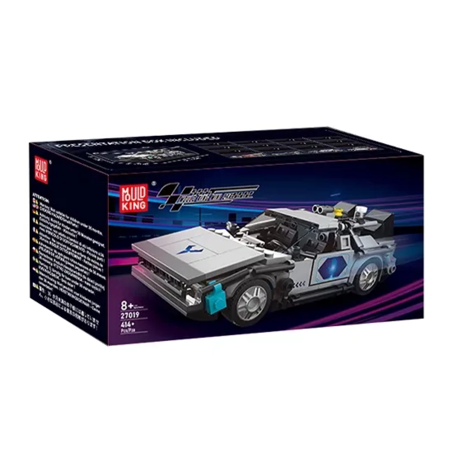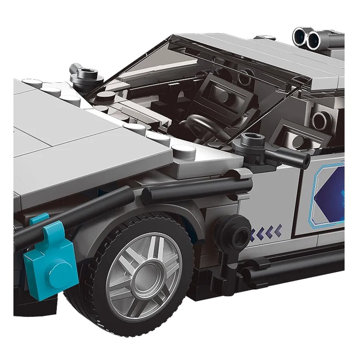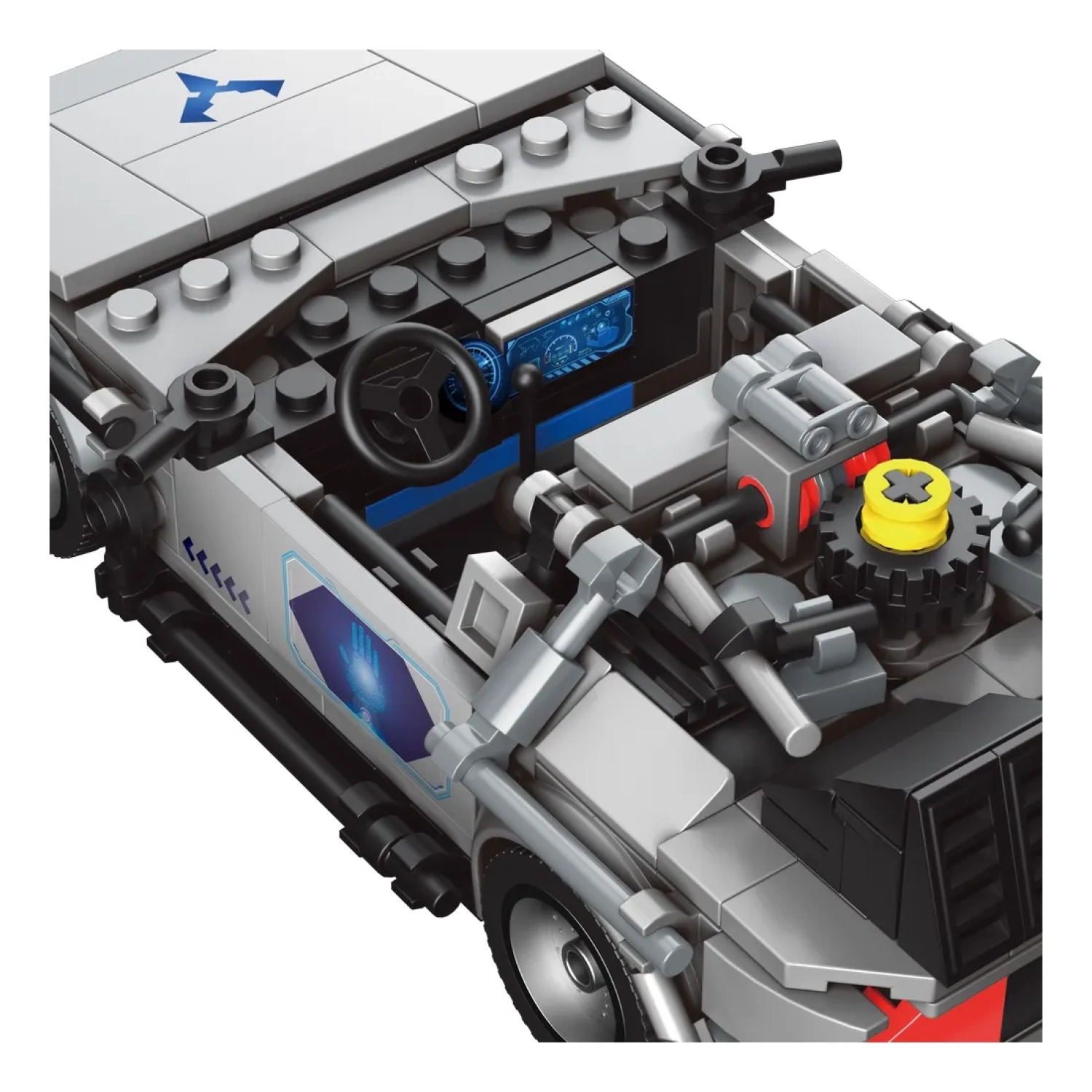 The DeLorean Time Machine Model Car is created with 392 pieces and 2.1 inch height, 6.3 inch length and 3.1 inch width. The car model has a steering wheel, a streamlined body, a transparent and environmentally friendly windshield, a large rear wing and sliding tires.