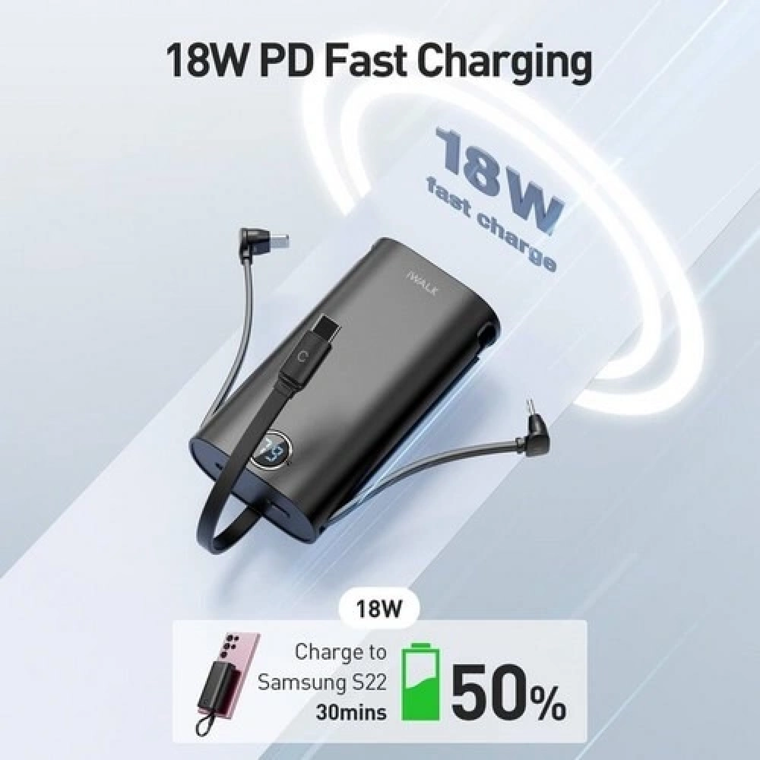 iWALK PowerSquid Portable Charger with Built-in 3 Cables, 9000mAh USB C Power Bank Fast Charging 18W PD with LED Display Black