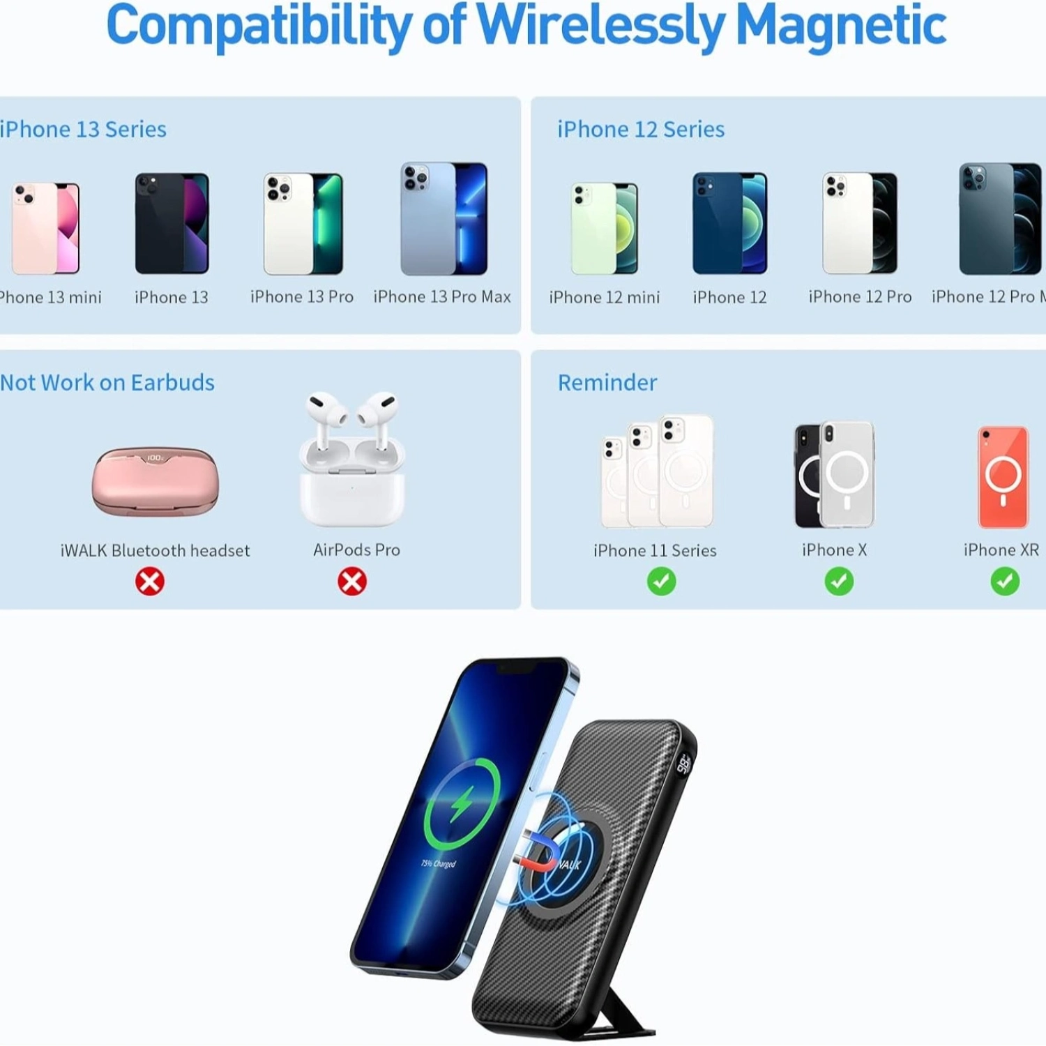 iWALK Magnetic Wireless Portable Charger Power Bank, 20000mAh with 7.5W Wireless Charging and 20W USB C Power Delivery Battery Pack, Smart LED & Kickstand, Black