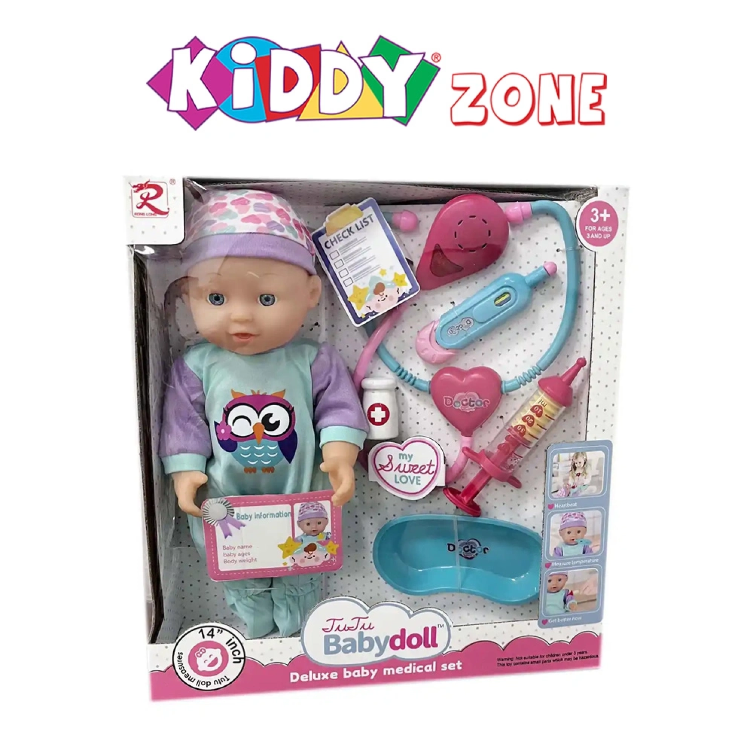 A 12-inch deluxe baby doll set featuring a complete medical kit and accessories for imaginative doctor play. Encourages creativity, empathy, and role-playing skills in children aged 3 years and above.