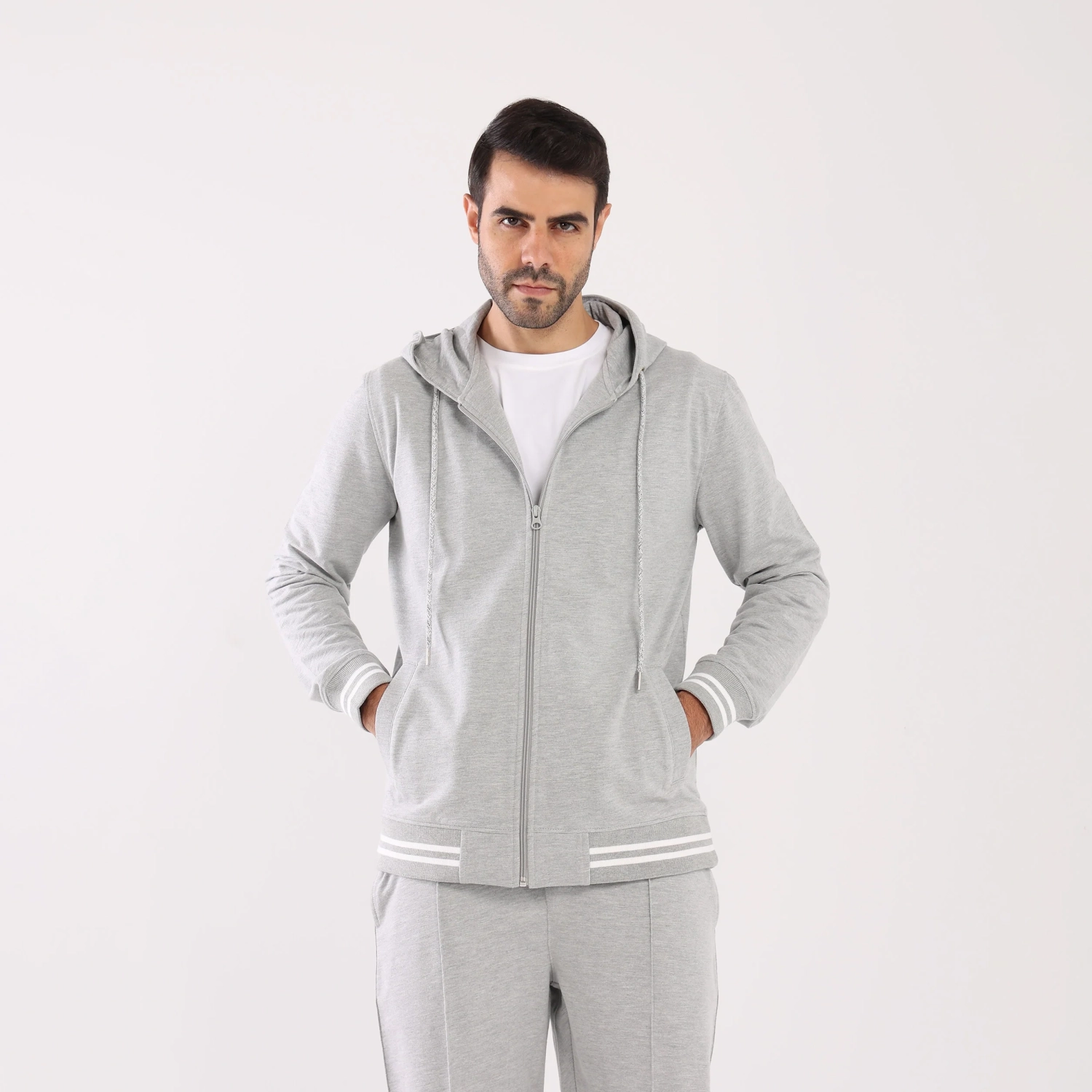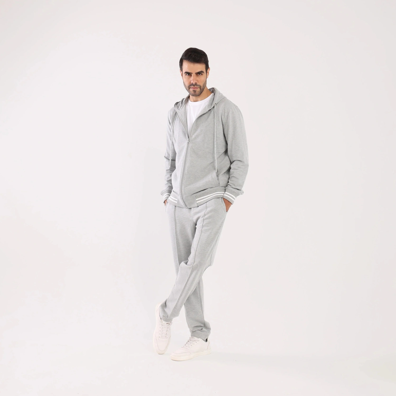 two-piece training suit, made from 100% cotton, offer a comfortable and stylish option for lounging and sleeping. The Grey color is so eye-catching, and the long cuffed sleeves add a touch of sophistication. The pants feature two side pockets and an elastic waist with an adjustable drawstring for a customized fit, making them ideal for all body shapes and sizes. Whether you're snuggled up in bed or running errands, these breathable and lightweight pajamas will keep you feeling comfortable all day long.
