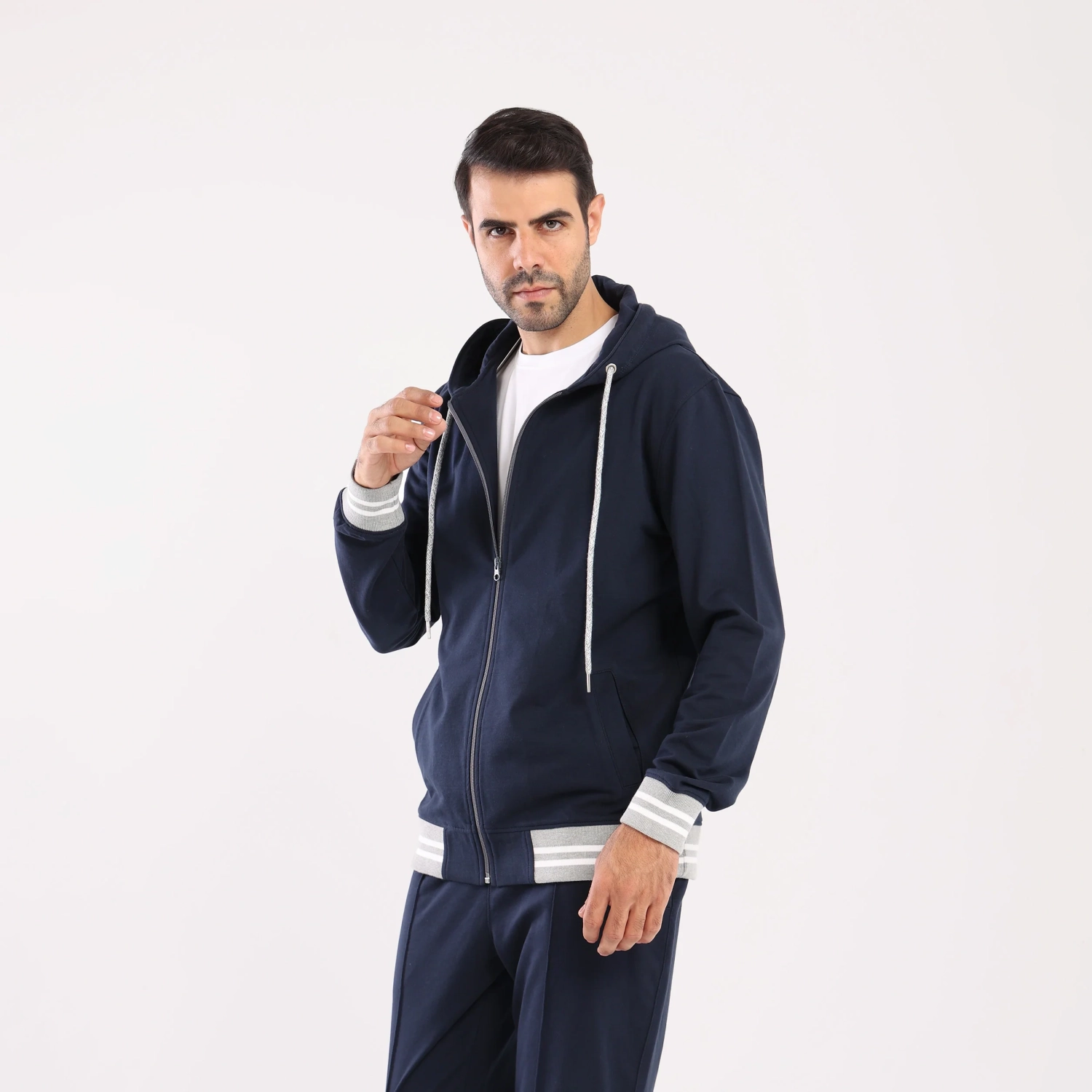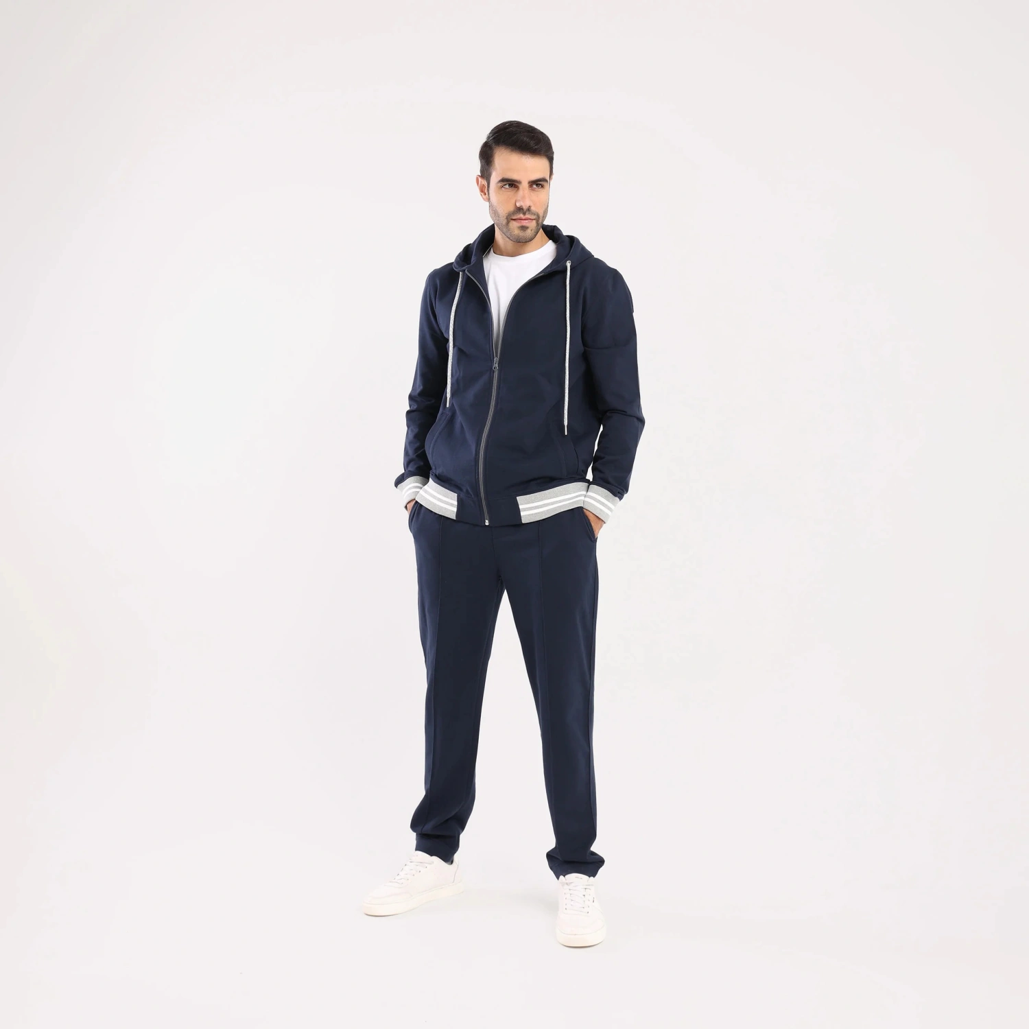two-piece training suit, made from 100% cotton, offer a comfortable and stylish option for lounging and sleeping. The navy color is so eye-catching, and the long cuffed sleeves add a touch of sophistication. The pants feature two side pockets and an elastic waist with an adjustable drawstring for a customized fit, making them ideal for all body shapes and sizes. Whether you're snuggled up in bed or running errands, these breathable and lightweight pajamas will keep you feeling comfortable all day long.