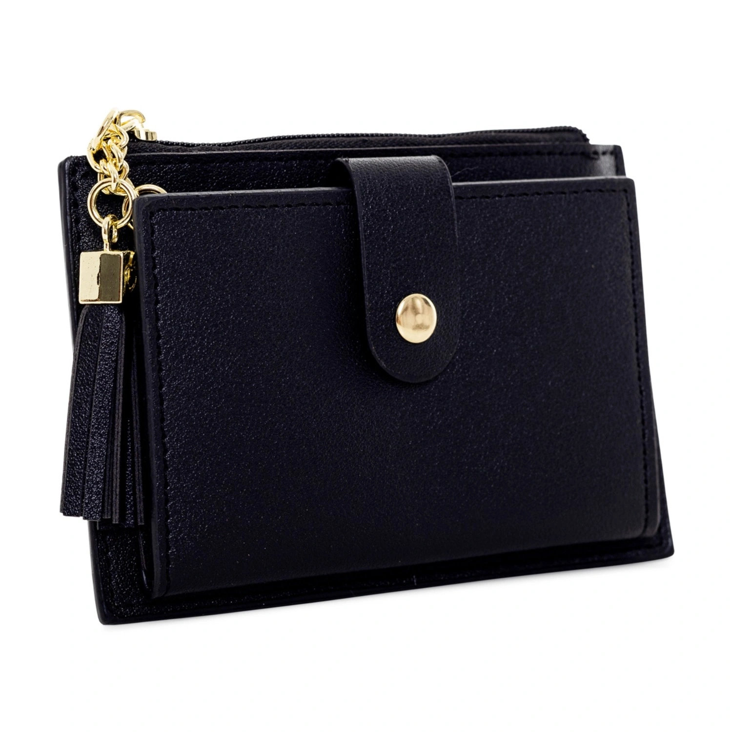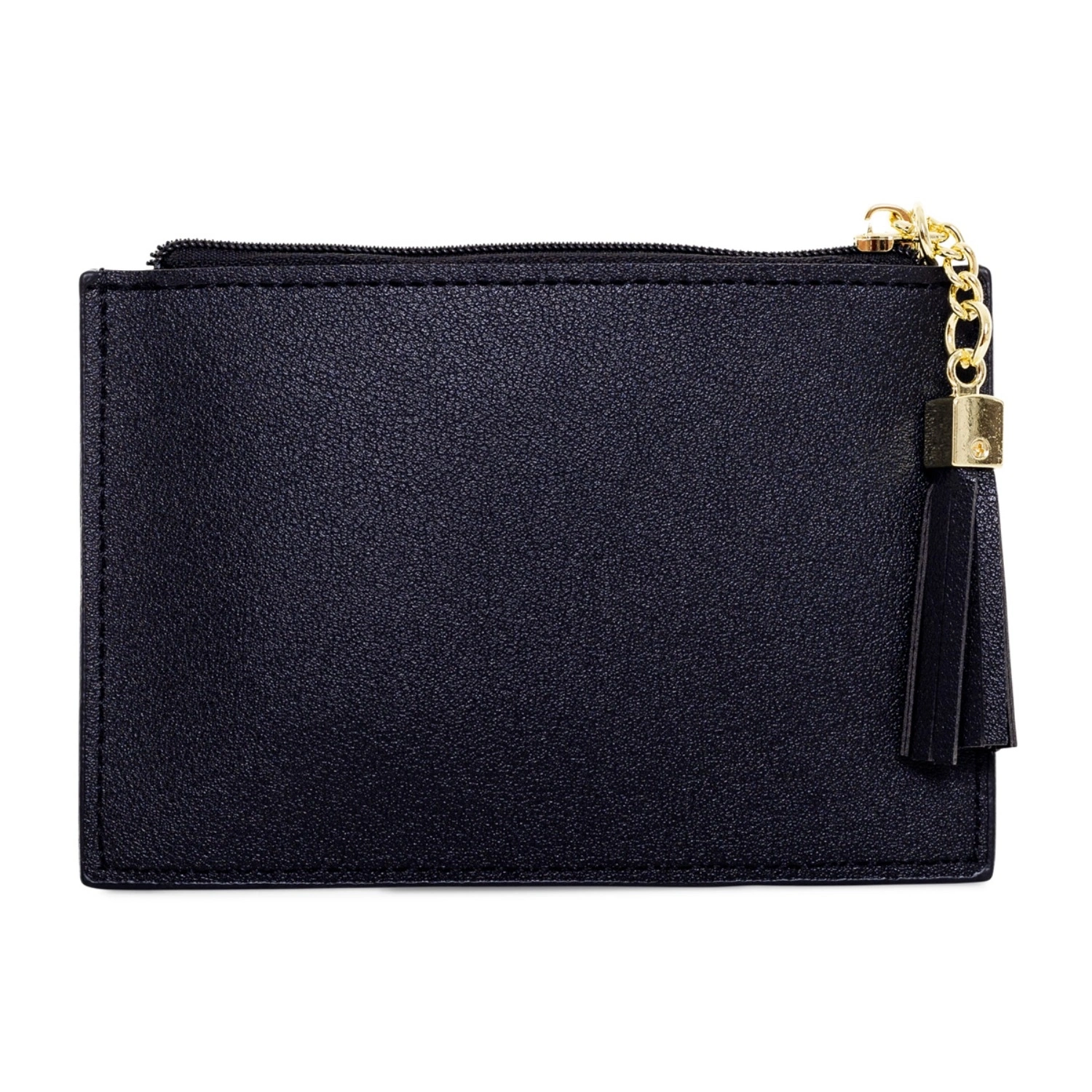 The Mavera Wallet is a modern essential crafted in soft-touch polyurethane, featuring a minimalist design accented with a detachable tassel charm and a playful gold-tone heart detail. With multiple card slots, a top-zip compartment, and a front snap pocket, it combines style and functionality in a compact silhouette. Measuring 13x9.5 cm, it is available in Ivory White, Camel Brown, and Ink Black.