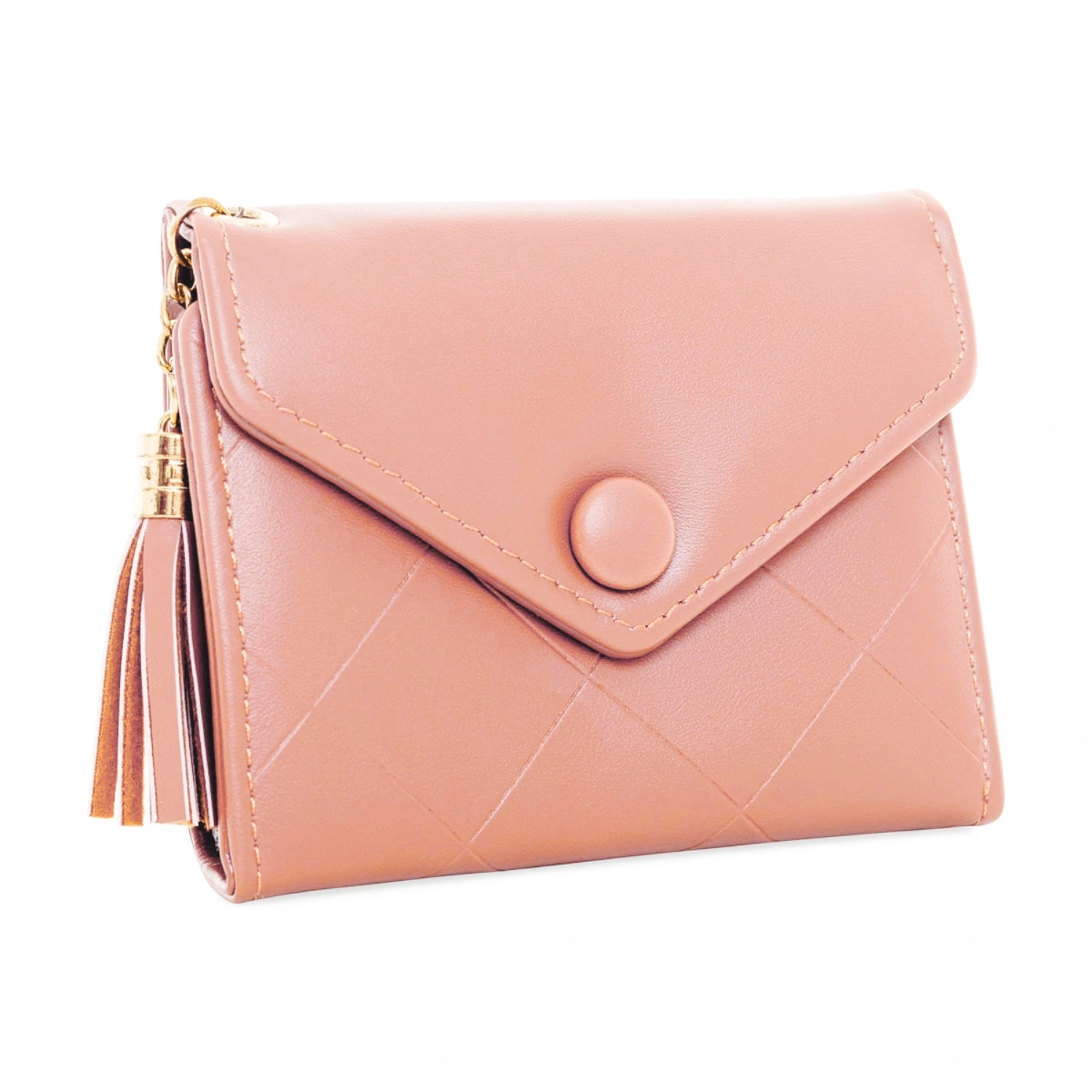 Crafted from high-quality eco leather, the Polly Women Wallet features a charming envelope flap enhanced by delicate quilted stitching, a top zipper closure, and a playful tassel detail. Available in Cinnamon Brown, Taupe Beige, Mocha Brown, Classic Black, Blush Rose, and Pearl White, this compact and elegant piece measures 11.5x9 cm.