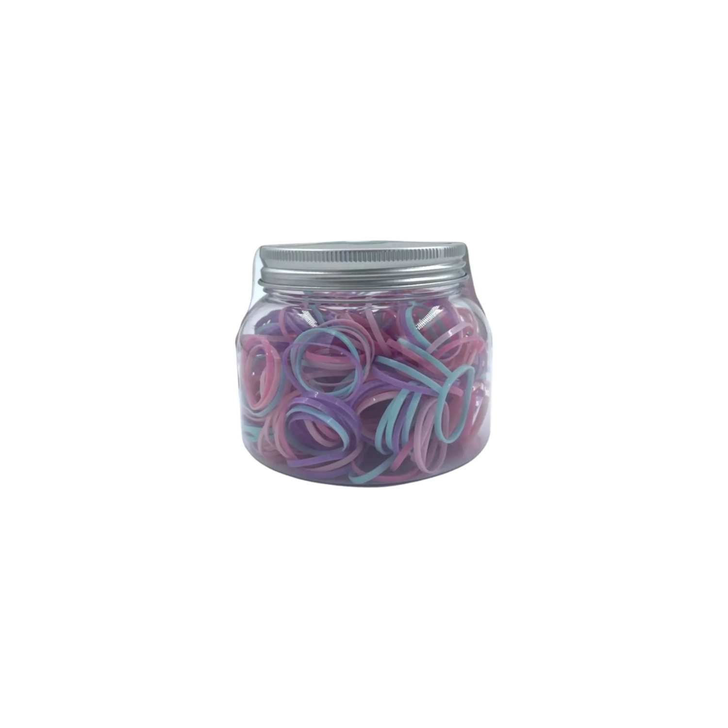 'A practical set of disposable rubber bands neatly stored in a barrel box for easy access. Ideal for hair styling, crafts, or organizing small items.