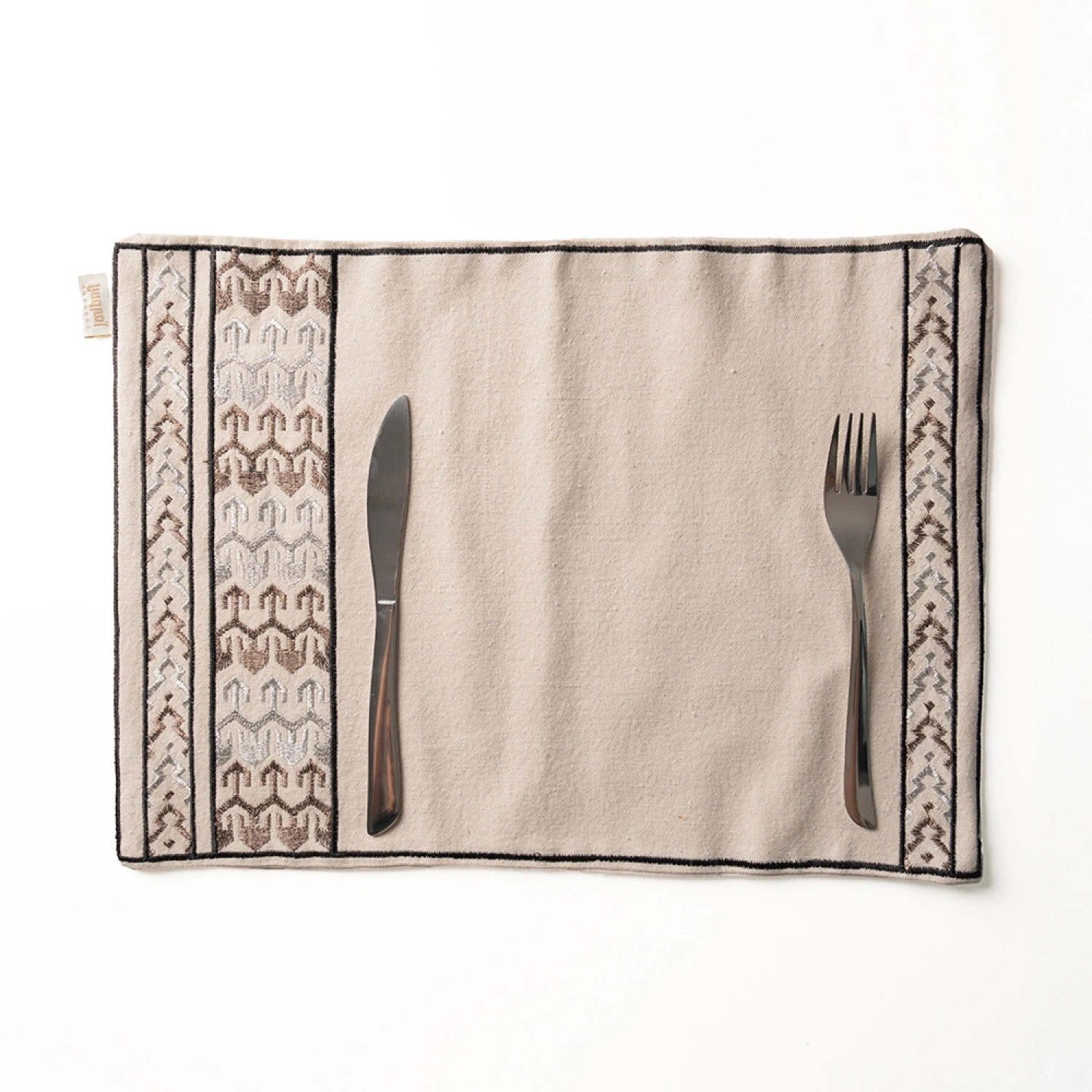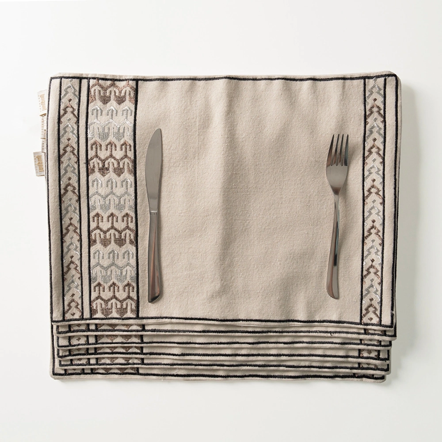 A stylish placemat featuring a minimalist design with elegant geometric embroidery along the edges, adding a modern touch of sophistication to your dining table. Crafted from high-quality materials for durability and easy maintenance, making it an ideal choice for both daily use and special occasions.