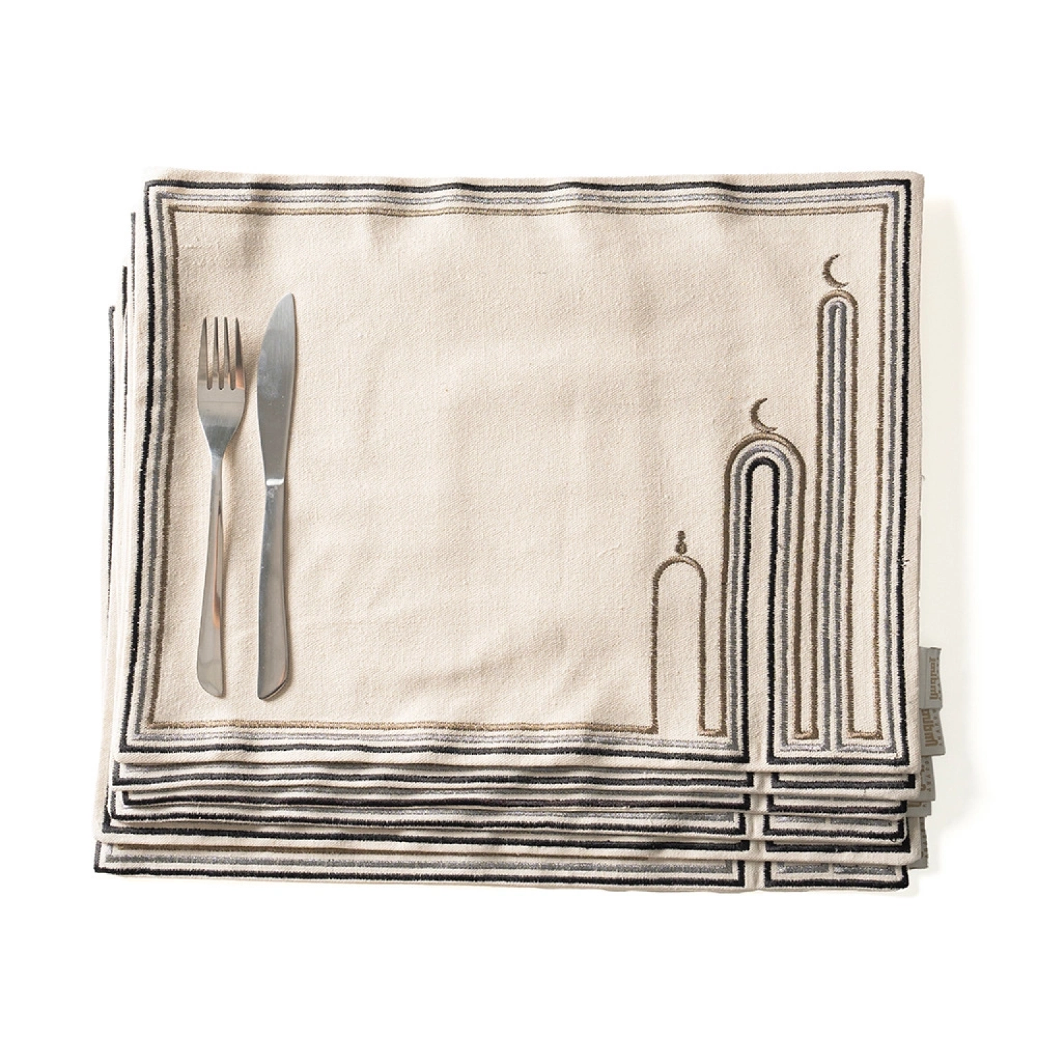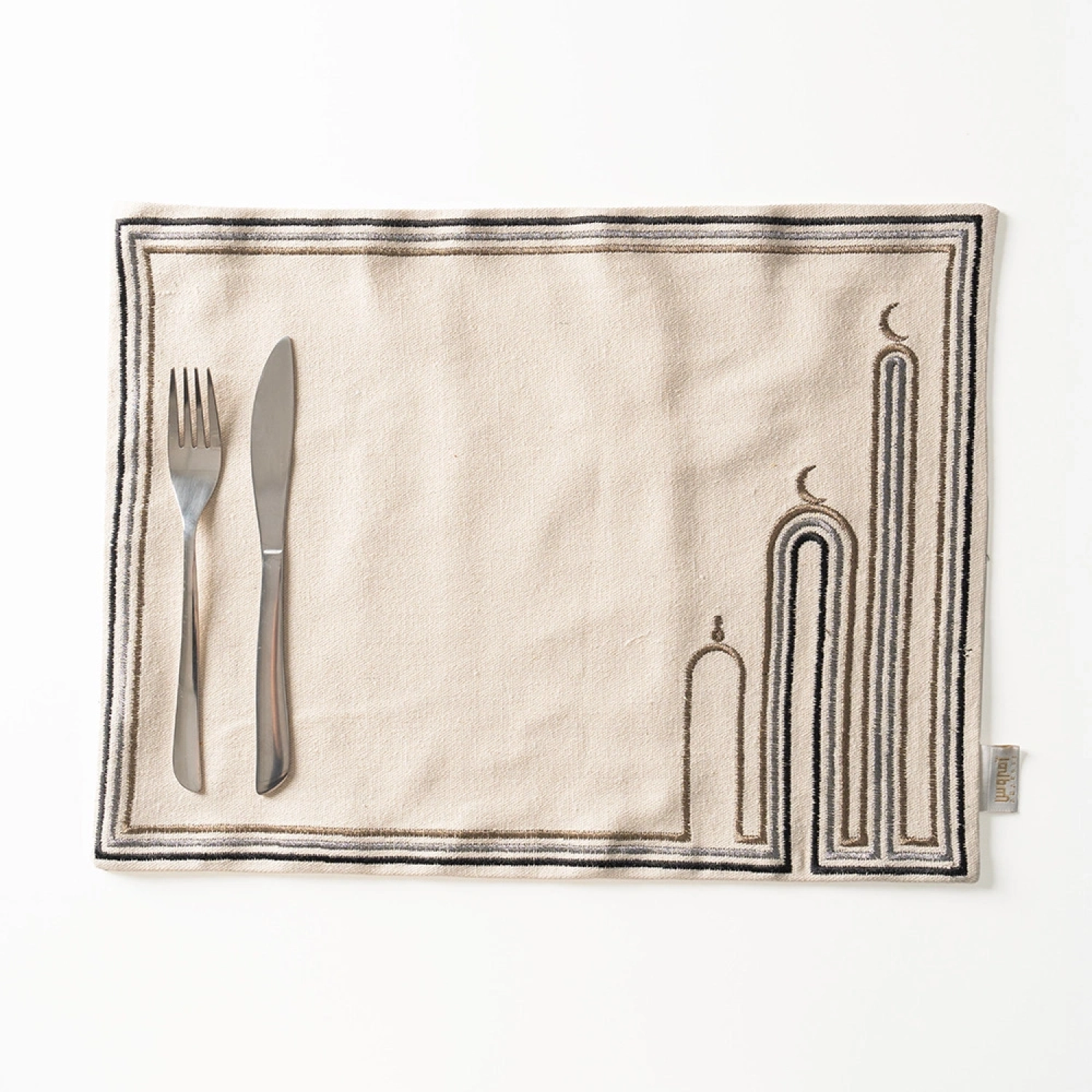 A sophisticated placemat featuring a design inspired by Islamic architecture, adorned with embroidered mosques and crescent moons in gold and silver accents, adding a spiritual touch to your dining table. Made from high-quality materials for durability and easy maintenance, perfect for Ramadan and special occasions.