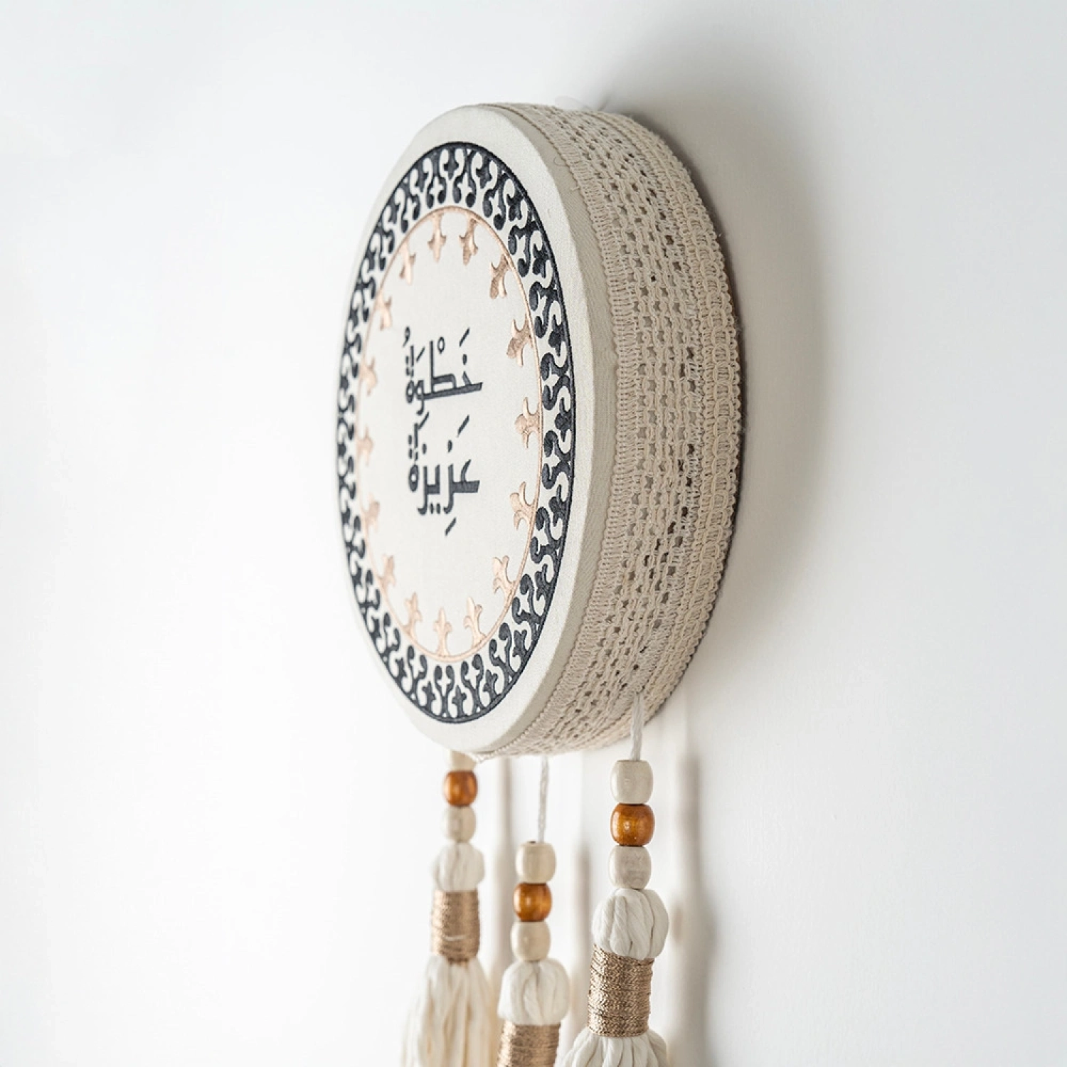 Enhance your space with this beautifully crafted wall hanging, featuring the phrase "Khatwah Azeezah”, symbolizing warm Arabic hospitality. Designed with intricate decorative patterns and an elegant frame, it is adorned with stylish cotton tassels and wooden beads for a perfect blend of tradition and modernity. Ideal for home décor, office spaces, or as a unique gift that embodies warmth and welcome.