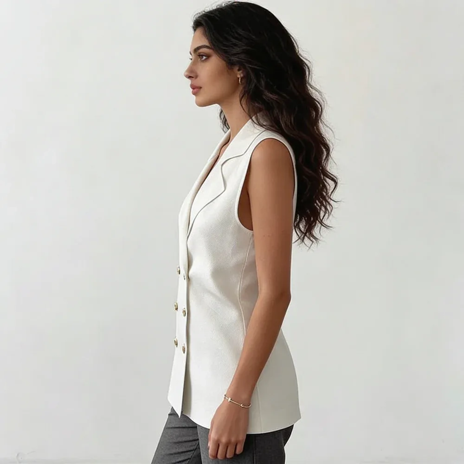 This elegant women’s vest is designed for formal and refined looks. Featuring clean lines and a tailored cut, it adds a sophisticated and polished touch to any outfit, making it perfect for professional and elegant styling.