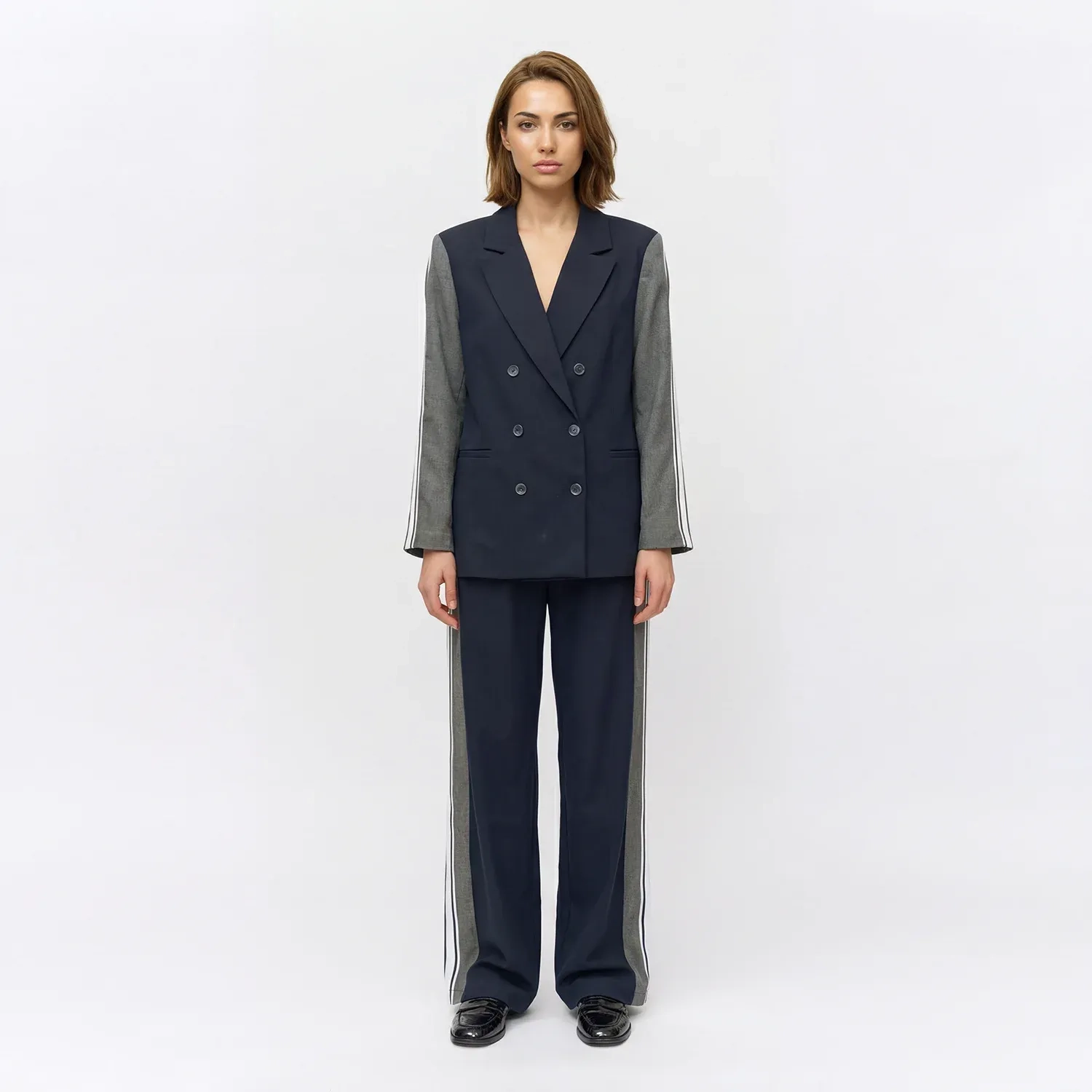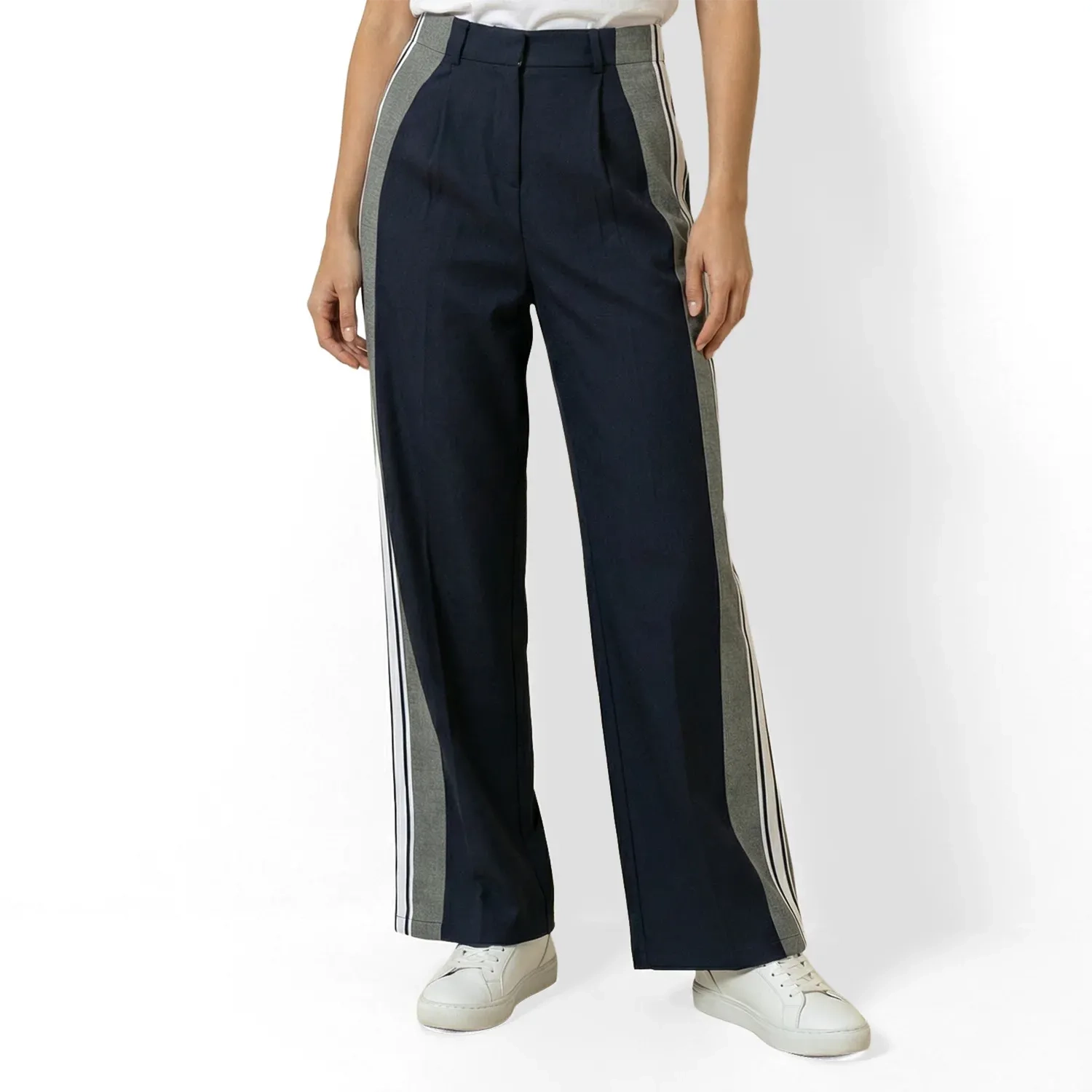 These navy blue casual pants with side stripes are designed to combine comfort with a